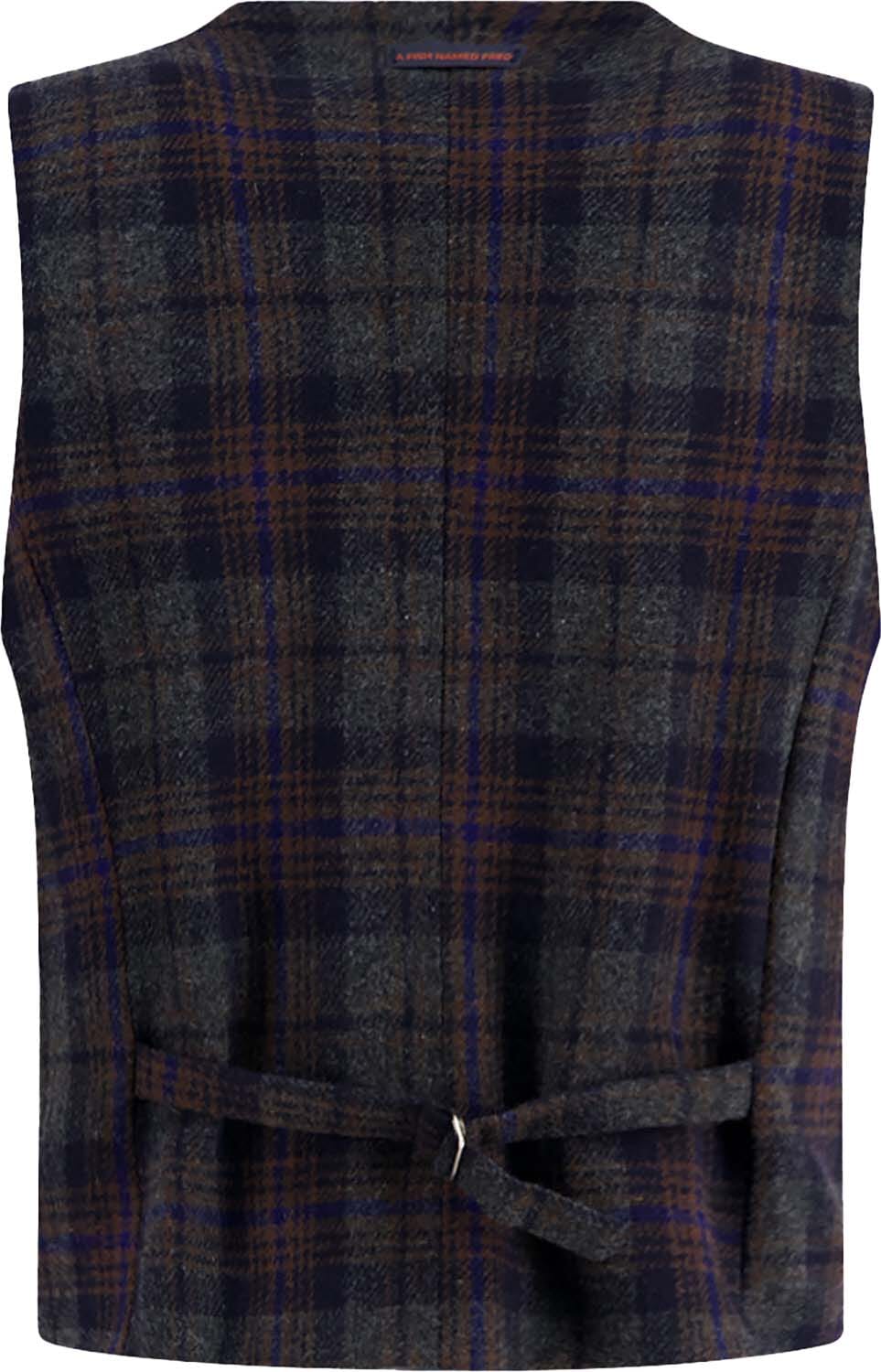 Het Gilet Tartan Wol van A Fish Named Fred is een stijlvol heren gilet met opstaande kraag, V-hals en een getailleerde pasvorm. Het ruitpatroon en de zakken aan de voorzijde maken het perfect voor nette gelegenheden. Sluiting met knopen biedt gemak en elegantie.