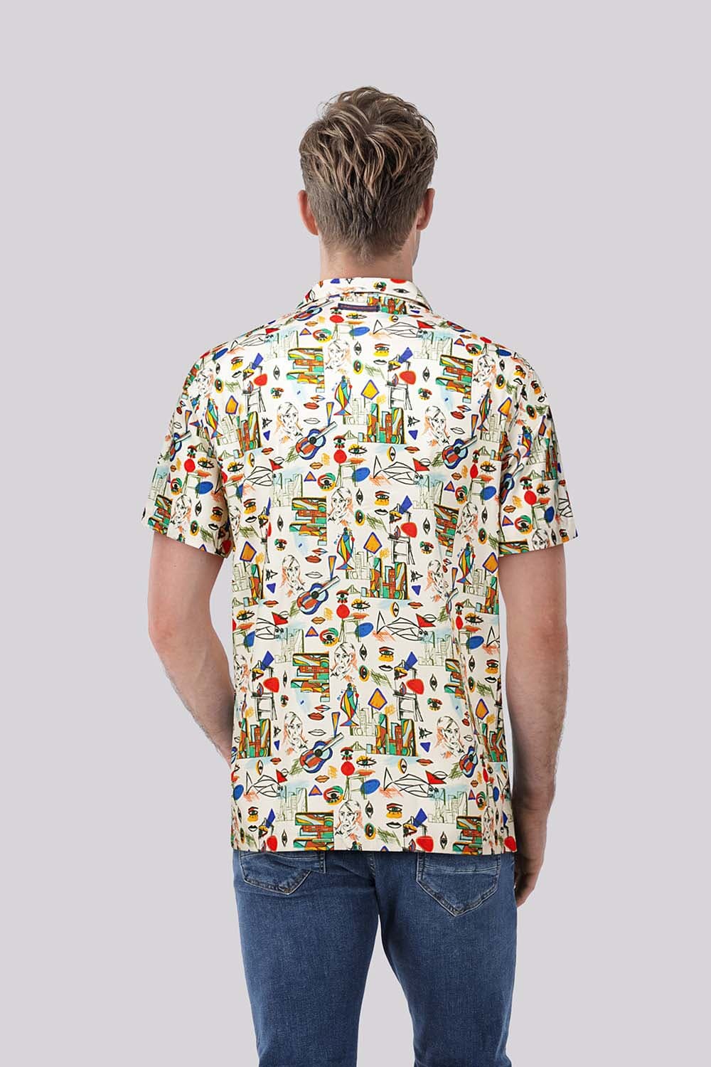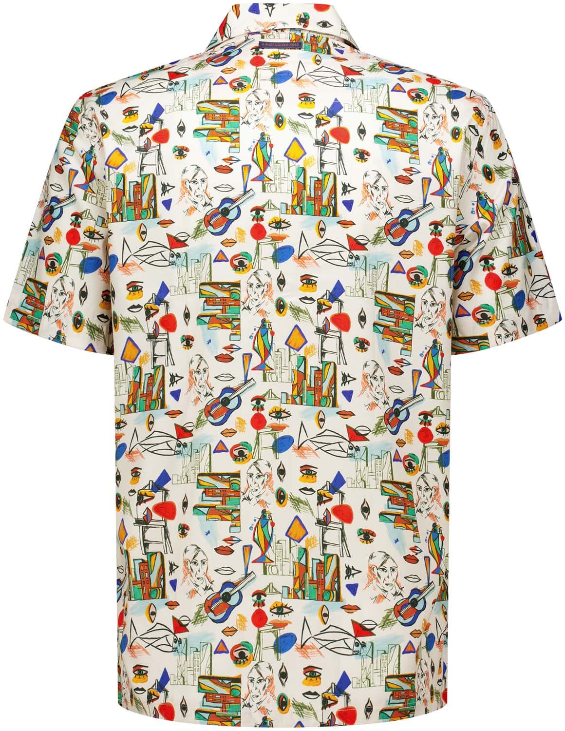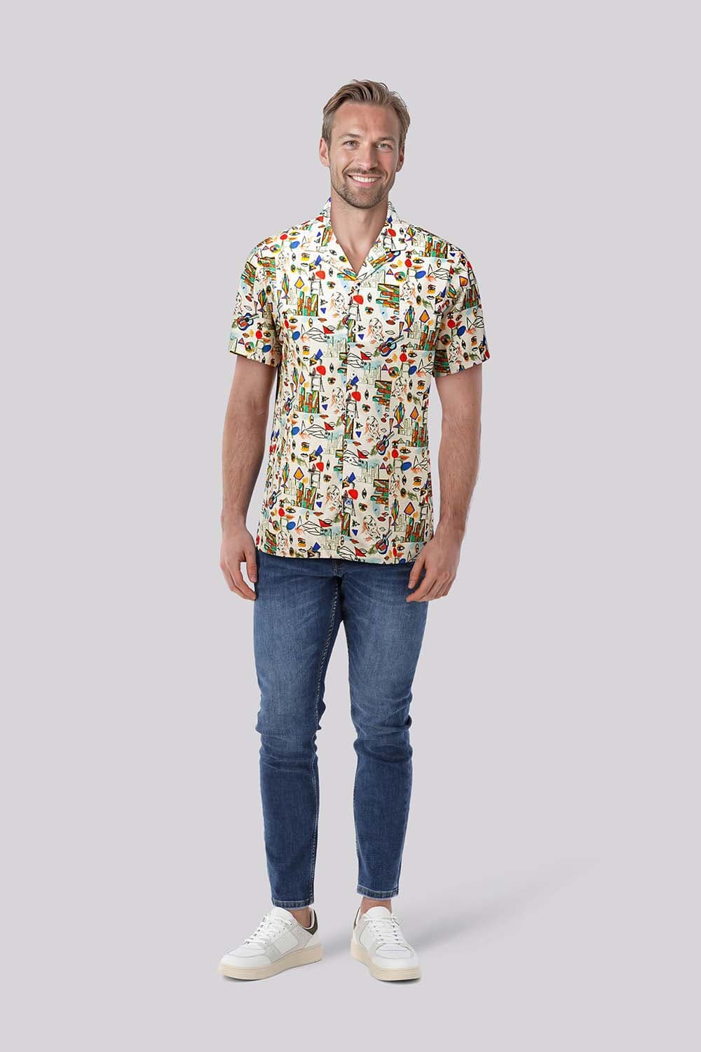 Overhemd Cubist van A Fish Named Fred is een casual overhemd met korte mouw, spreidkraag en knoopsluiting met knoopkraag. De lichte ondergrond heeft een all-over, grafisch dessin met speelse illustraties. Draagt luchtig en combineert makkelijk met denim of een chino.