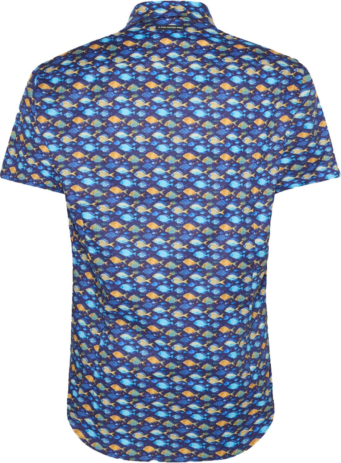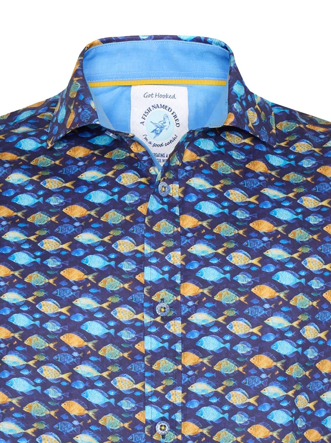 Het overhemd Fish van A Fish Named Fred is een casual herenoverhemd met korte mouwen en een speelse dierenprint. De button down halslijn en knoopsluiting zorgen voor een stijlvolle uitstraling. Ideaal voor een ontspannen dag of een informele gelegenheid.