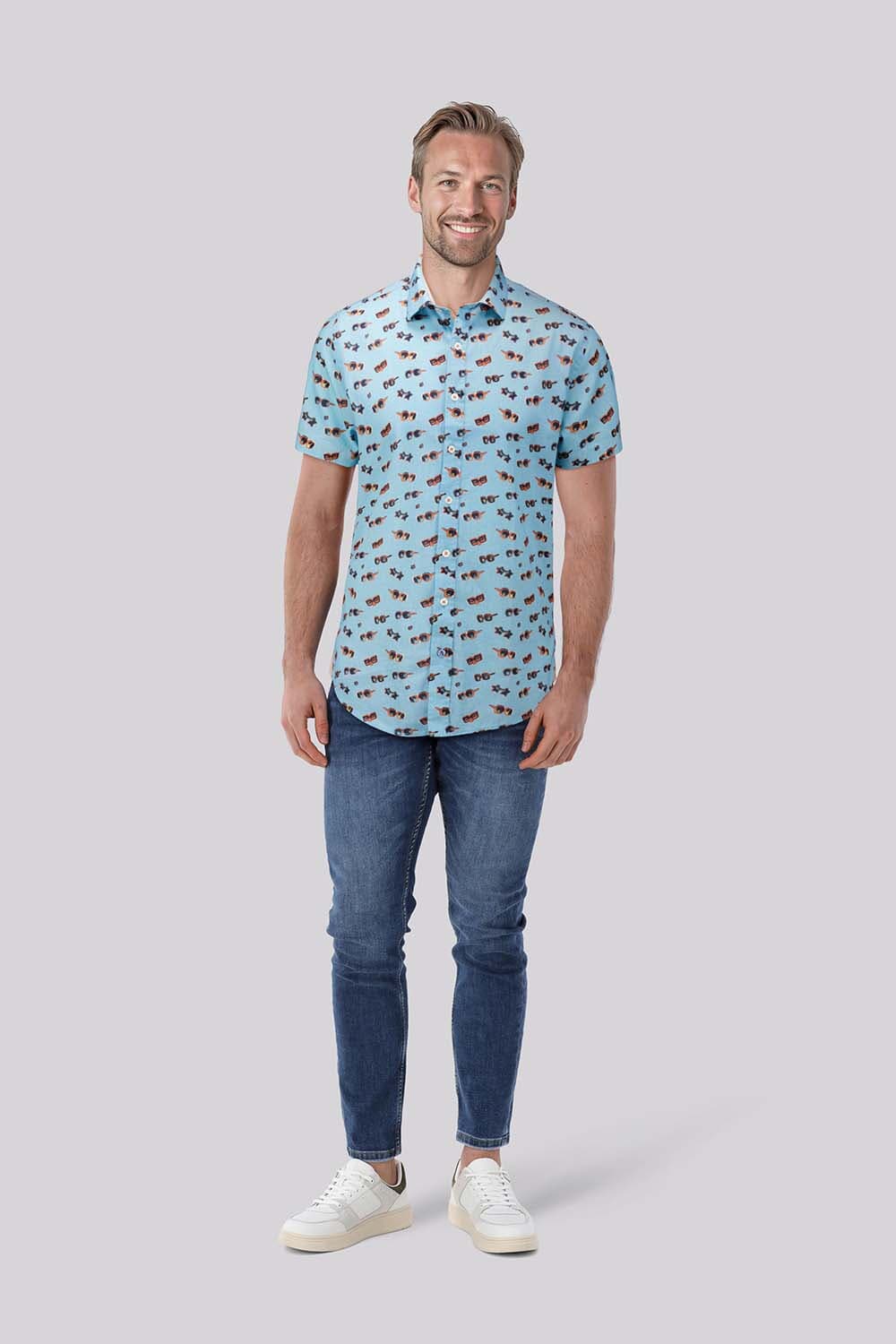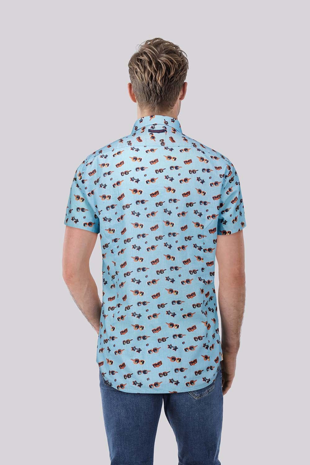 Overhemd Sunglasses van A Fish Named Fred is een casual overhemd met korte mouw, spreidkraag en knoopsluiting. De lichtblauwe stof heeft een all-over print met zonnebrillen. Recht model met afgeronde zoom voor een relaxte pasvorm. Combineer met een jeans en sneakers.