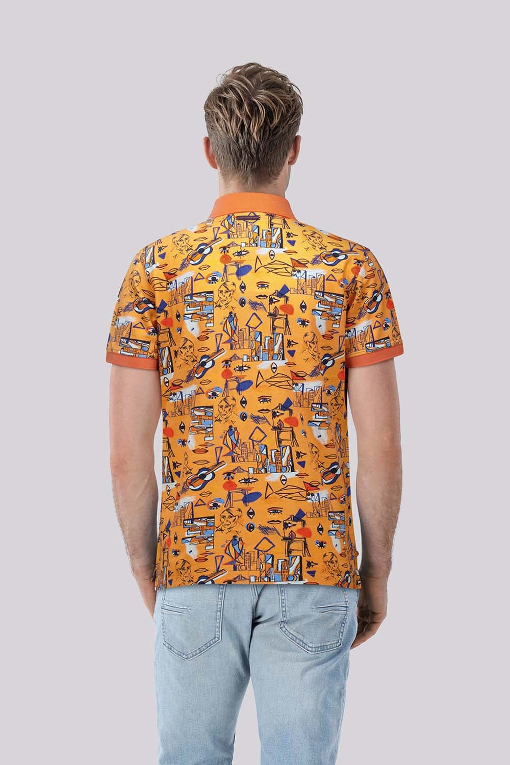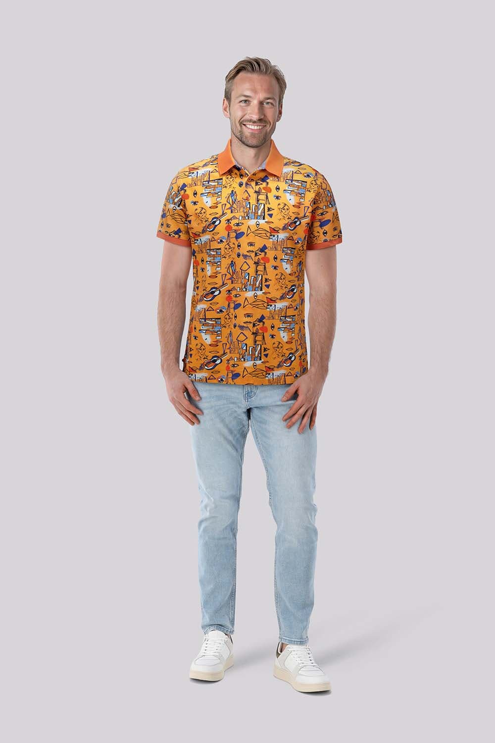 Polo Cubist polo van A Fish Named Fred heeft een casual regular pasvorm, korte mouwen, een polokraag en knoopsluiting. De all-over, grafische print met speelse illustraties en de contrasterende kraag en boorden geven karakter. Combineer met een chino of jeans voor een relaxte outfit.