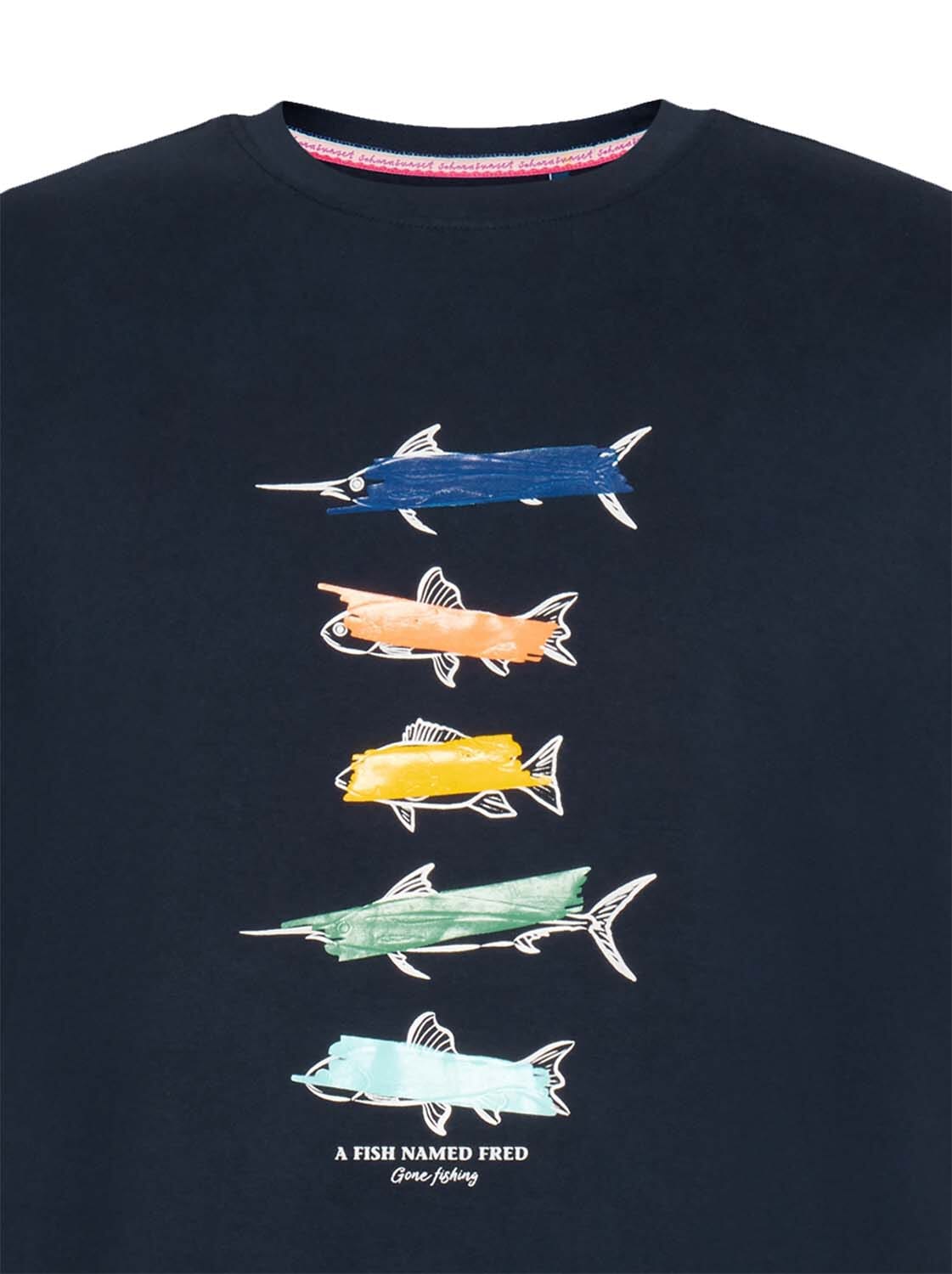 Het T-shirt Fish van A Fish Named Fred is een casual heren T-shirt met een ronde hals en korte mouwen. Het heeft een opvallend grafisch patroon met kleurrijke vissen, ideaal voor een relaxte gelegenheid. Dit comfortabele shirt combineert stijlvol design met een frisse uitstraling.