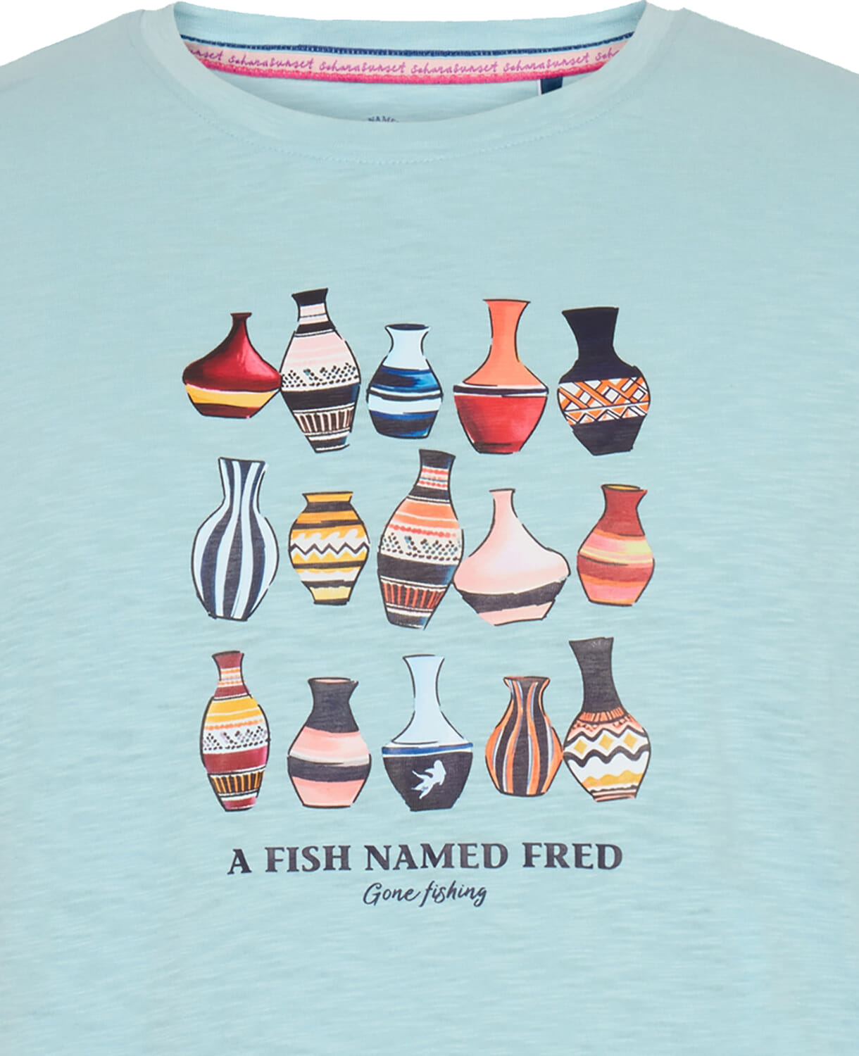 Het T-shirt Vase van A Fish Named Fred is een casual heren T-shirt met een grafisch patroon van kleurrijke vazen. Dit unisex kledingstuk heeft een ronde hals en korte mouwen, perfect voor een ontspannen gelegenheid. Geniet van de stijlvolle uitstraling en het comfort.
