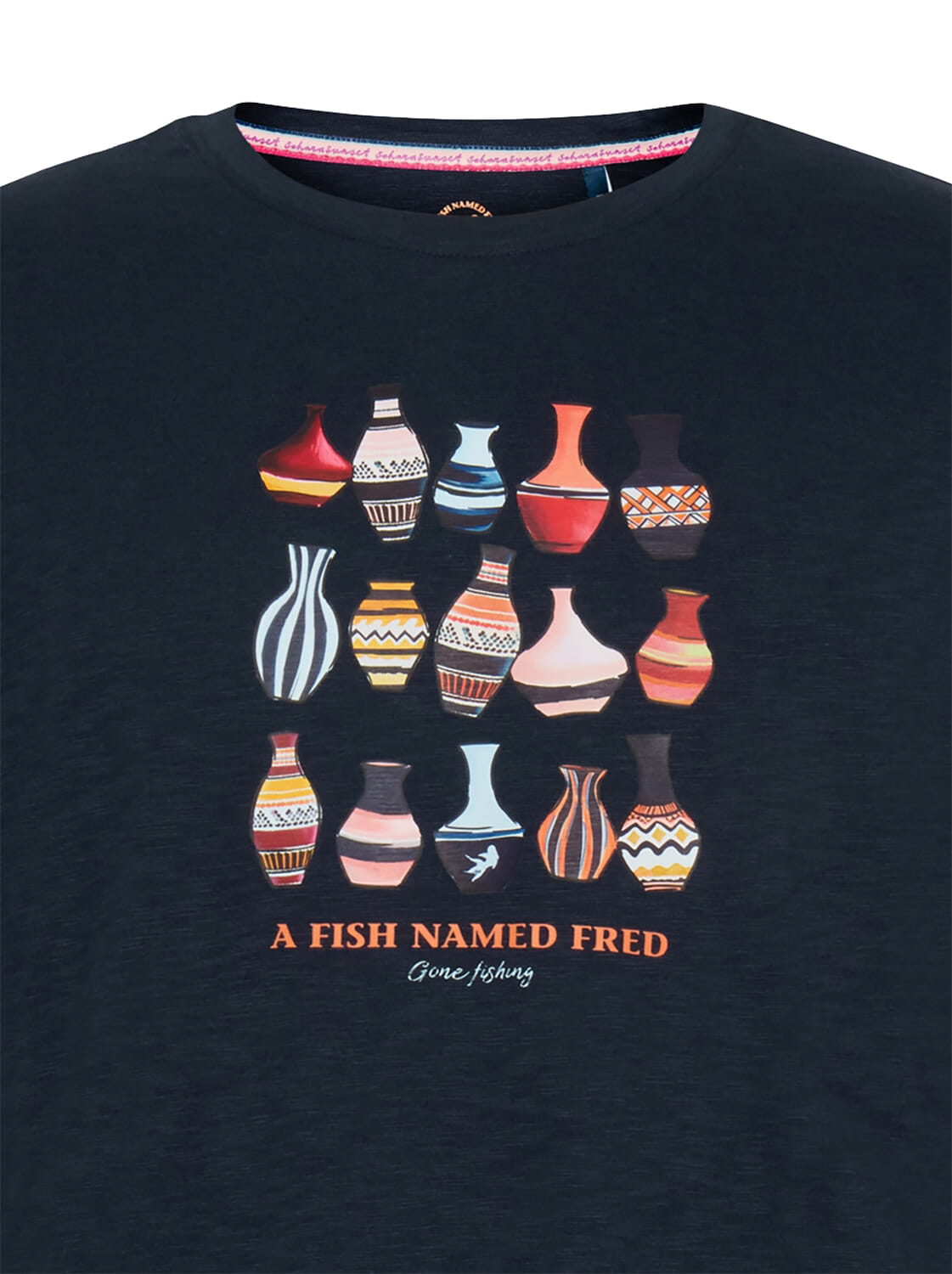 Het T-shirt Vase van A Fish Named Fred is een casual heren T-shirt met een grafisch patroon van kleurrijke vazen. Dit unisex kledingstuk heeft een ronde hals en korte mouwen, perfect voor een ontspannen gelegenheid. Geniet van de stijlvolle uitstraling en het comfort.