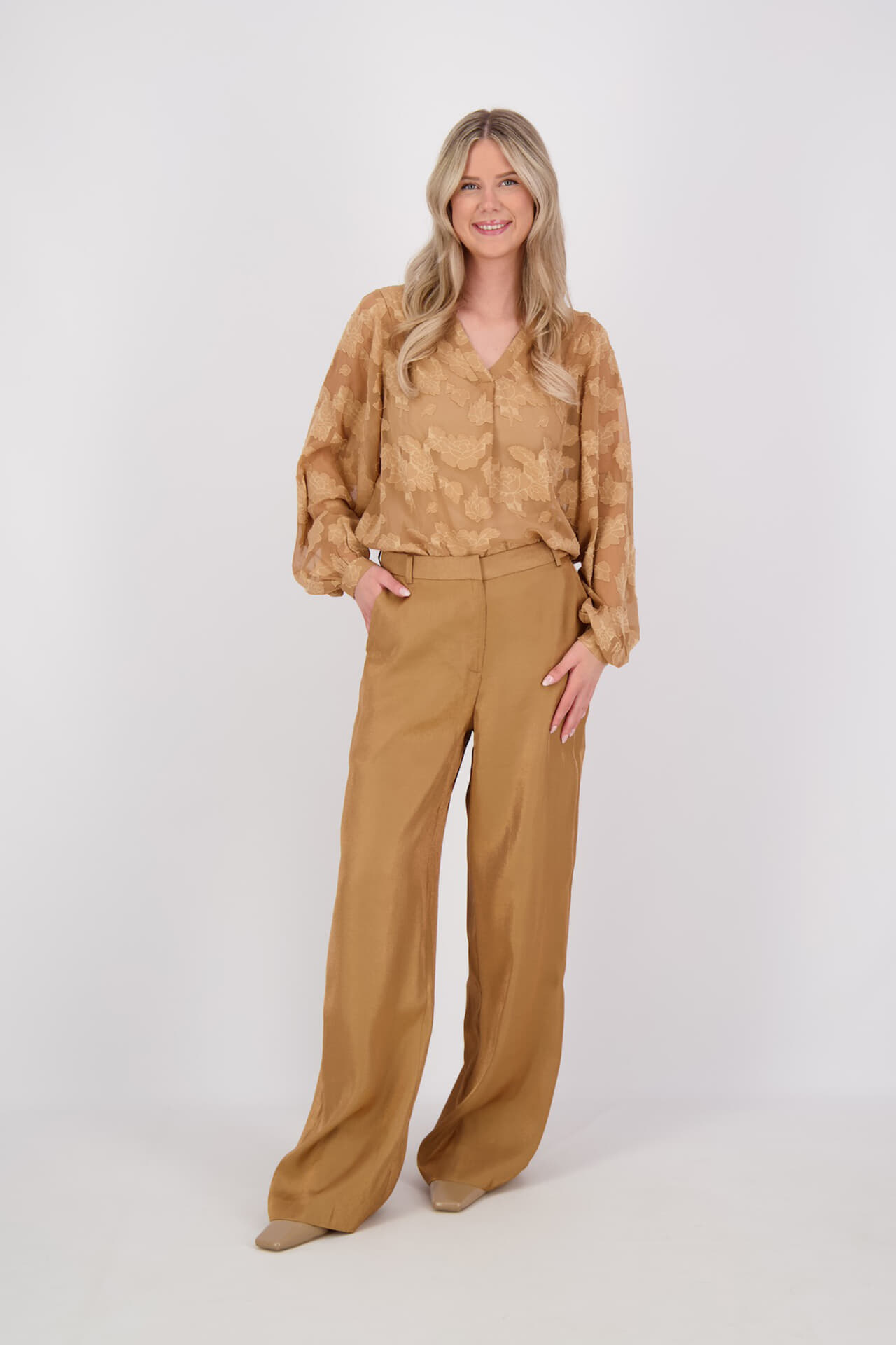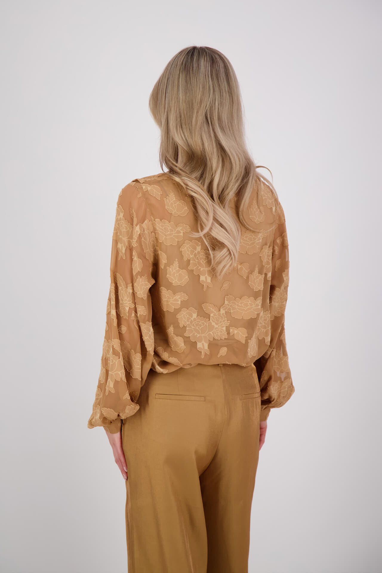 Blouse Alana van Aaiko is een top lange mouw met V-hals, regular pasvorm en een bloemendessin met subtiele glans. De lange mouwen hebben een manchet met elastiek voor een nette afwerking. Combineer met een pantalon of rok voor een verzorgde uitstraling.