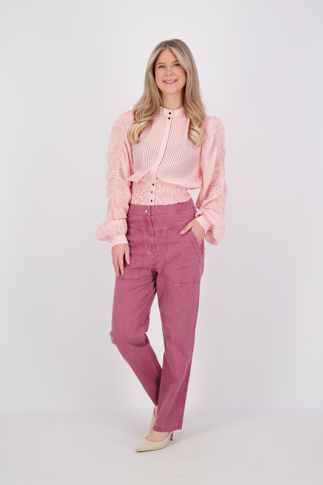 Blouse Beadine van Aaiko is een blouse met streep, opstaand boord en knoopsluiting. De regular pasvorm zit prettig, de lange mouwen hebben manchetten met knopen. Subtiele plooien op de schouders en een gesmokte tailleband geven vorm. Combineer met een high-waist broek.