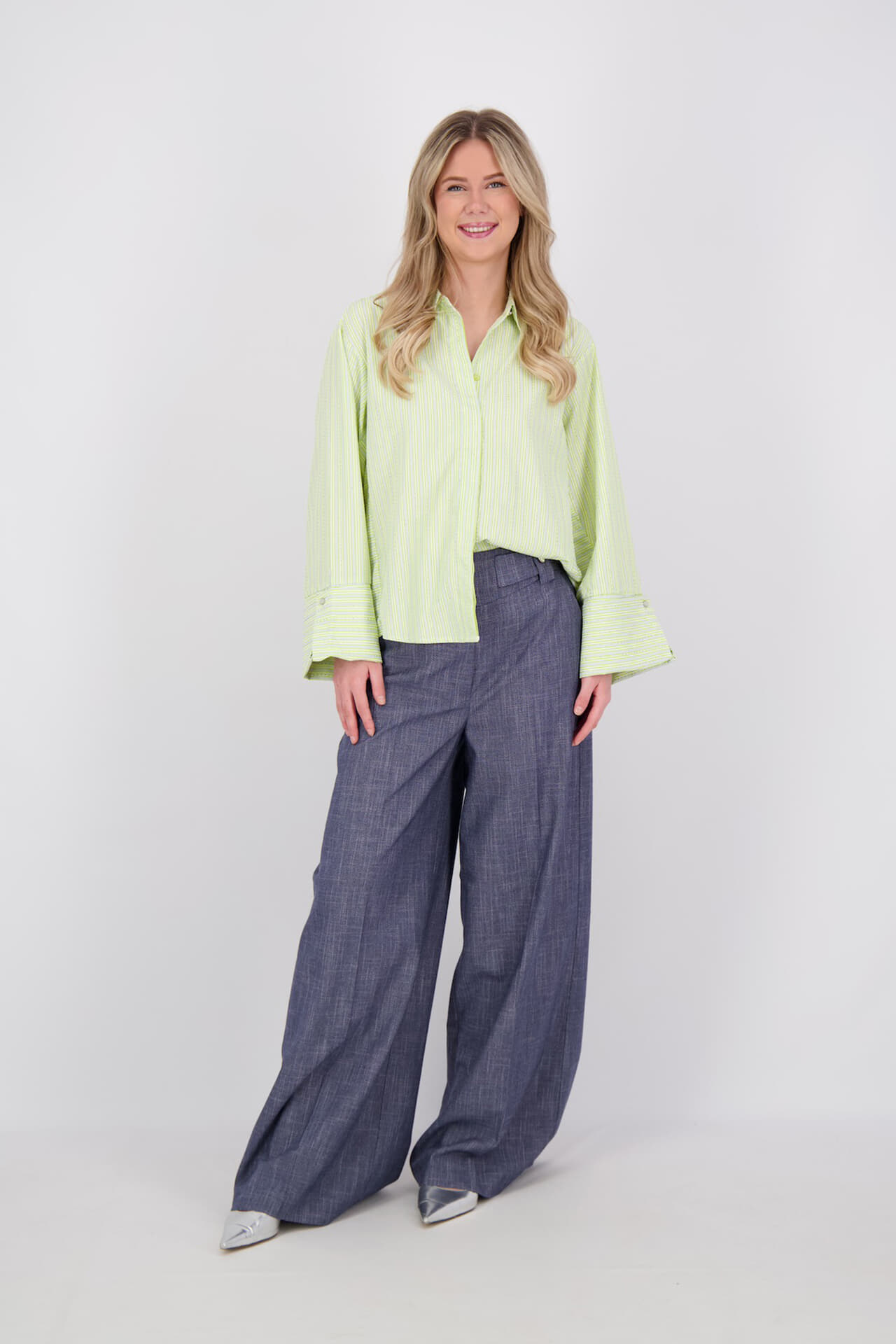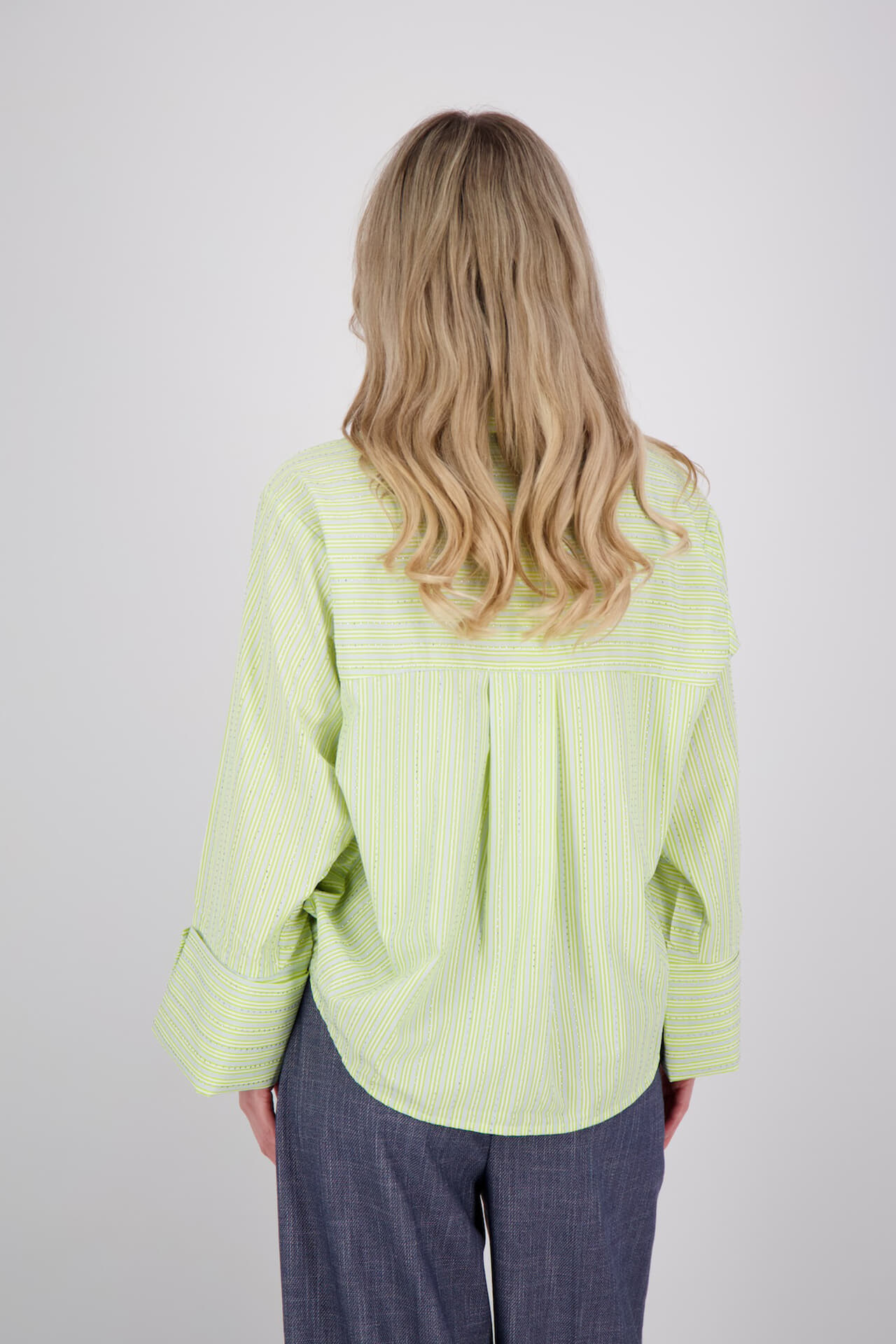 De Elda Blouse is een losvallend model met een klassieke kraag en opvallende brede manchetten. Het gestreepte dessin is subtiel verwerkt met strassdetails die zorgen voor een lichte shimmer. Gemaakt van een gladde, licht glanzende stof die soepel valt en comfortabel draagt.