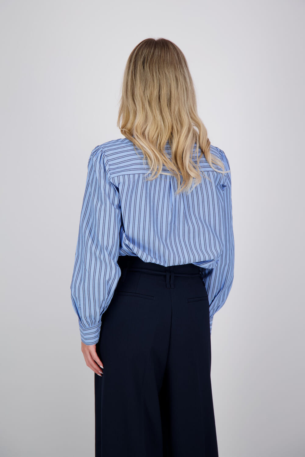 Blouse Fenne Strass van Aaiko is een stijlvolle blouse met een strik kraag en lange mouwen. De streepjesprint en knoopsluiting geven het een elegante uitstraling, ideaal voor nette gelegenheden. Combineer het met andere kledingstukken voor een complete look.