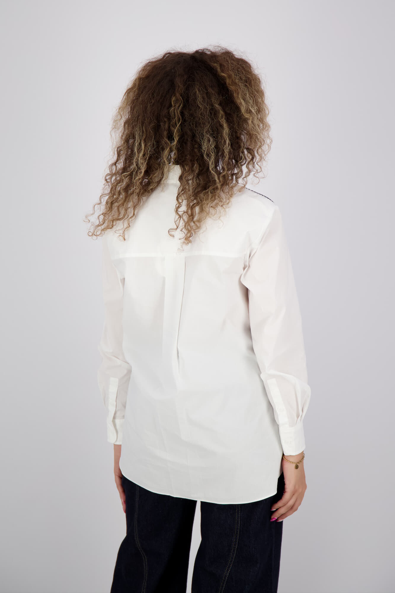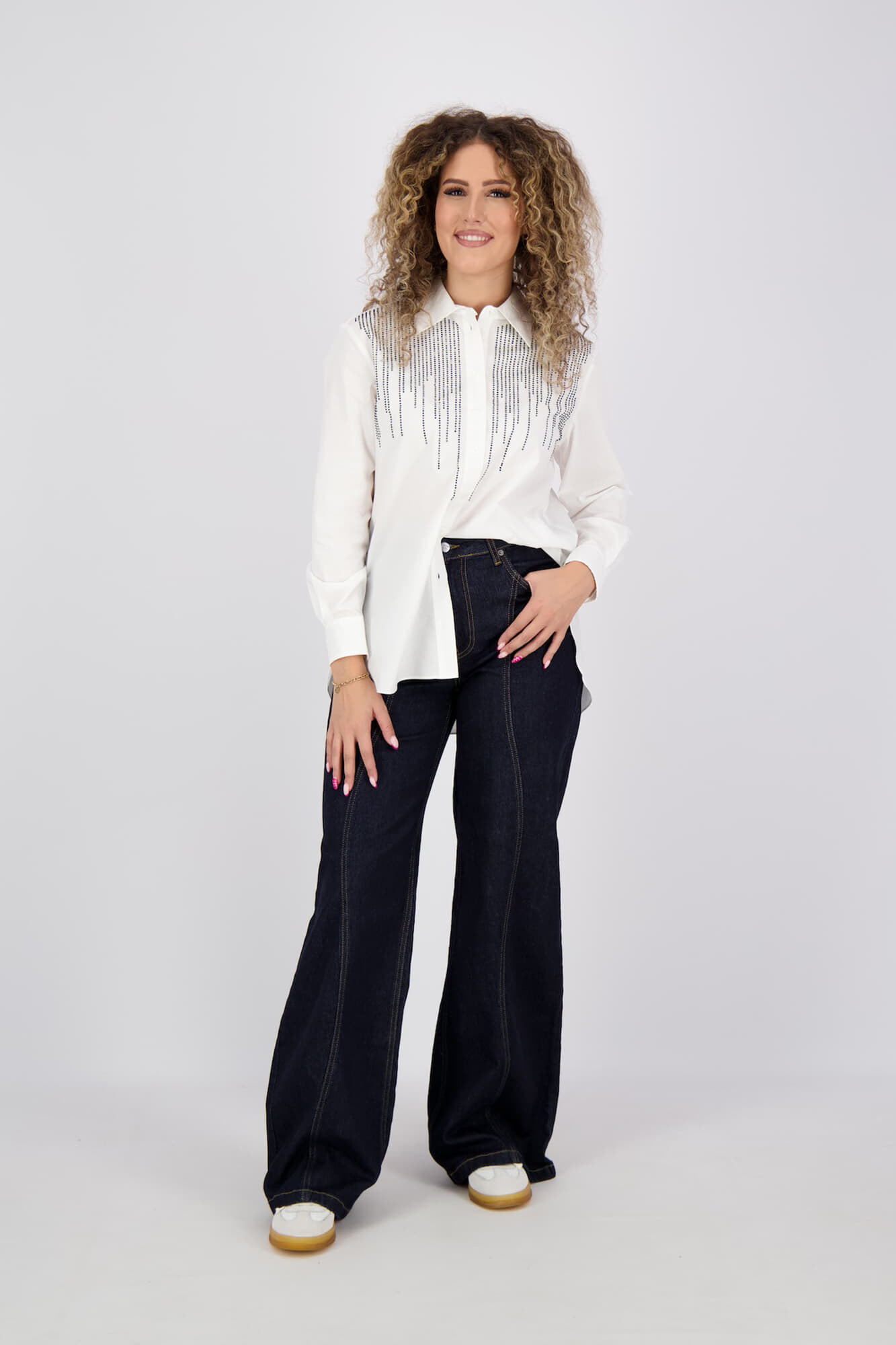 De Blouse Joan Strass van Aaiko is een stijlvolle casual dames blouse met een button down kraag en lange mouwen. Het effen patroon wordt verfijnd door elegante strassdetails op de borst, wat een unieke touch toevoegt aan de klassieke uitstraling.