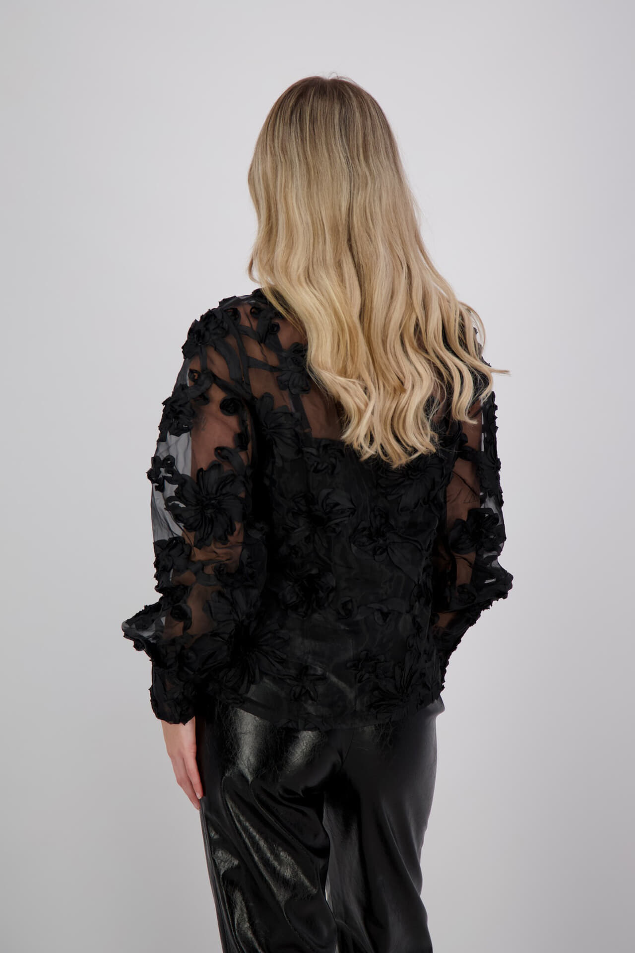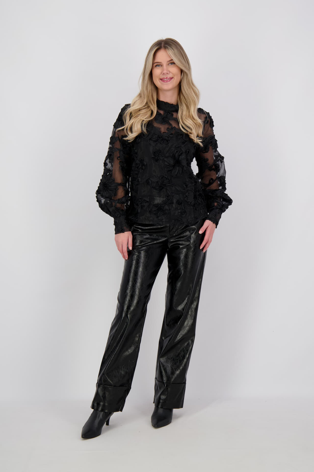 Blouse Lucia Flower van Aaiko is een elegante blouse met een opstaande kraag en lange mouwen. Het bloemenpatroon geeft een feestelijke uitstraling, perfect voor speciale gelegenheden. De transparante stof en gedetailleerde afwerking maken het een stijlvol en verleidelijk kledingstuk.