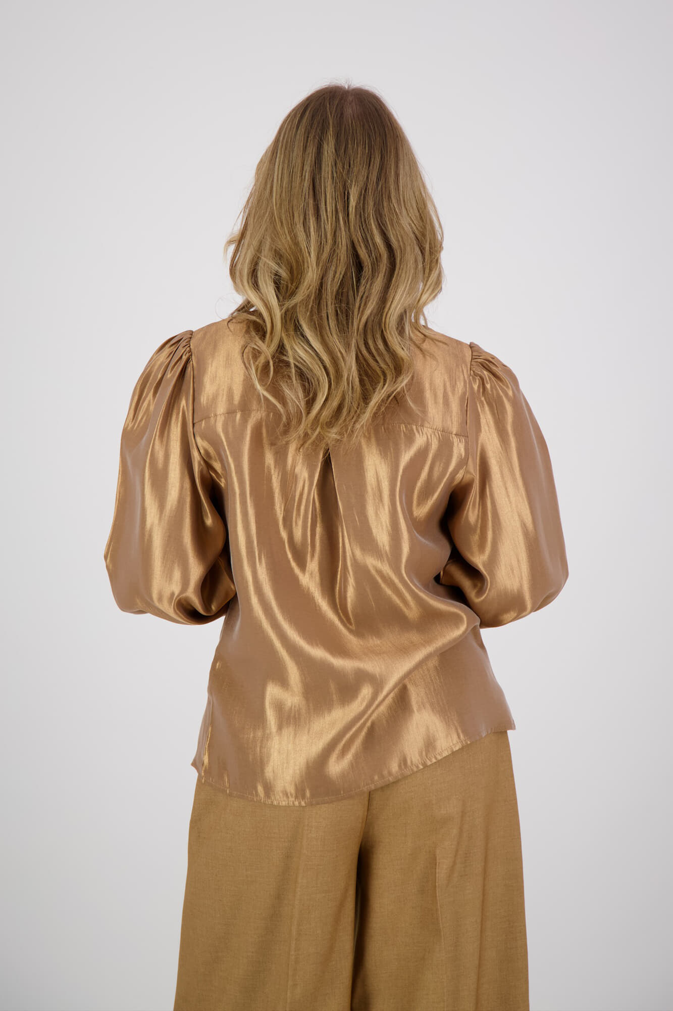 Blouse Veronne Tie Shimm van Aaiko is een trendy dames blouse met een strik kraag en V-hals. De lange mouwen eindigen in manchetknopen voor een nette uitstraling. Dit effen ontwerp biedt een regular fit, perfect voor diverse gelegenheden.
