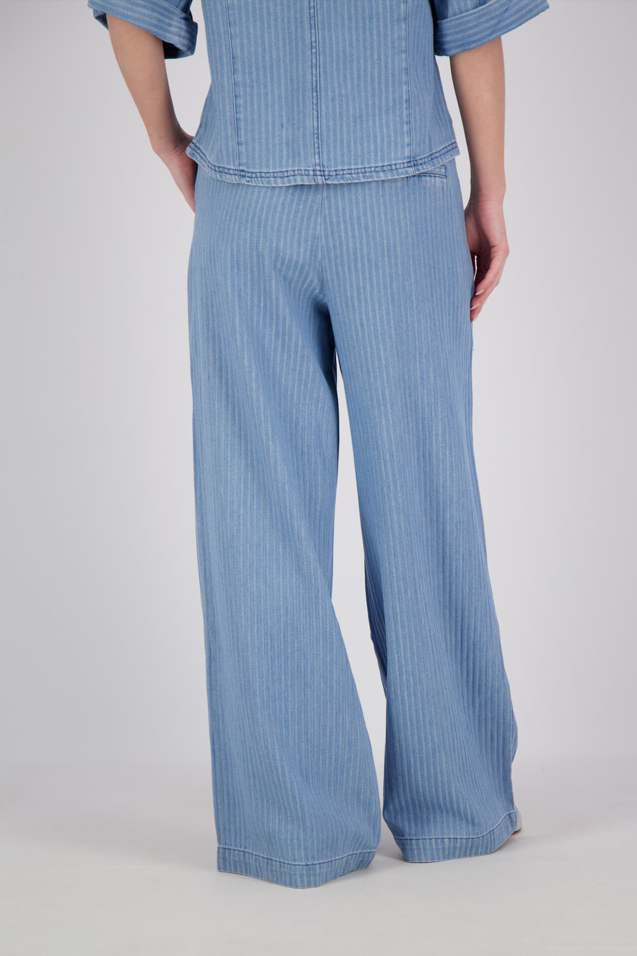 Broek Lotty Stripe van Aaiko is een pantalon met wijde pijpen en subtiele strepen. De elastische taille schuift makkelijk aan en zit soepel. Voorzakken geven ruimte voor essentials. De luchtige stof valt recht en comfortabel. Combineer met een effen top en sneakers voor casual dagen.