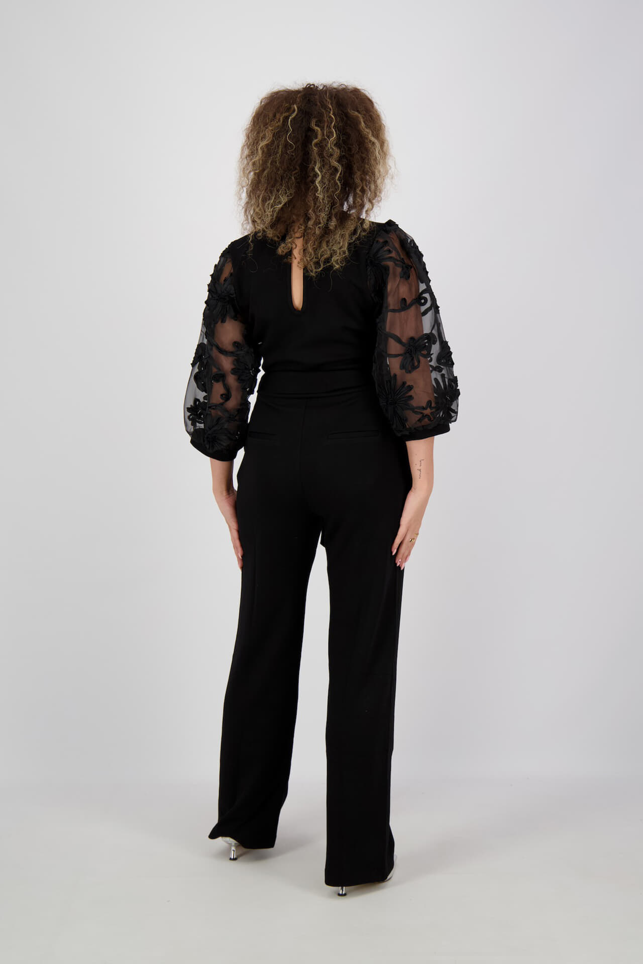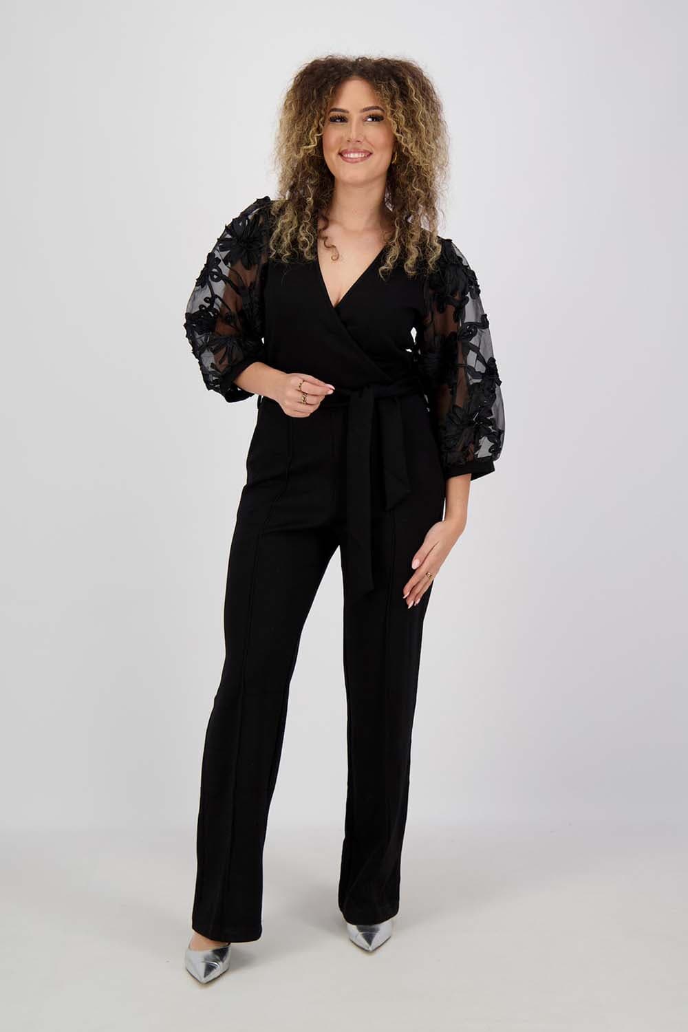 De Jumpsuit Lizeth van Aaiko is een stijlvolle dames jumpsuit met een verfijnde uitstraling. Deze elegante jumpsuit heeft een normale taille en een koordsluiting. De lange mouwen zijn versierd met prachtig borduurwerk, wat een unieke touch geeft aan het effen patroon.