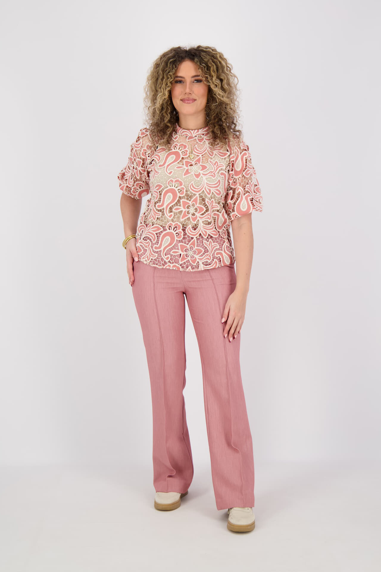 Top Shaila van Aaiko, top korte mouw met regular pasvorm en opstaand boord. Het bloemen-, paisleypatroon en de semi-transparante kantstructuur geven diepte. 3/4 mouwen met elastische manchet zitten comfortabel. Afgewerkt met knoop- en ritssluiting. Combineer met een effen broek of rok.