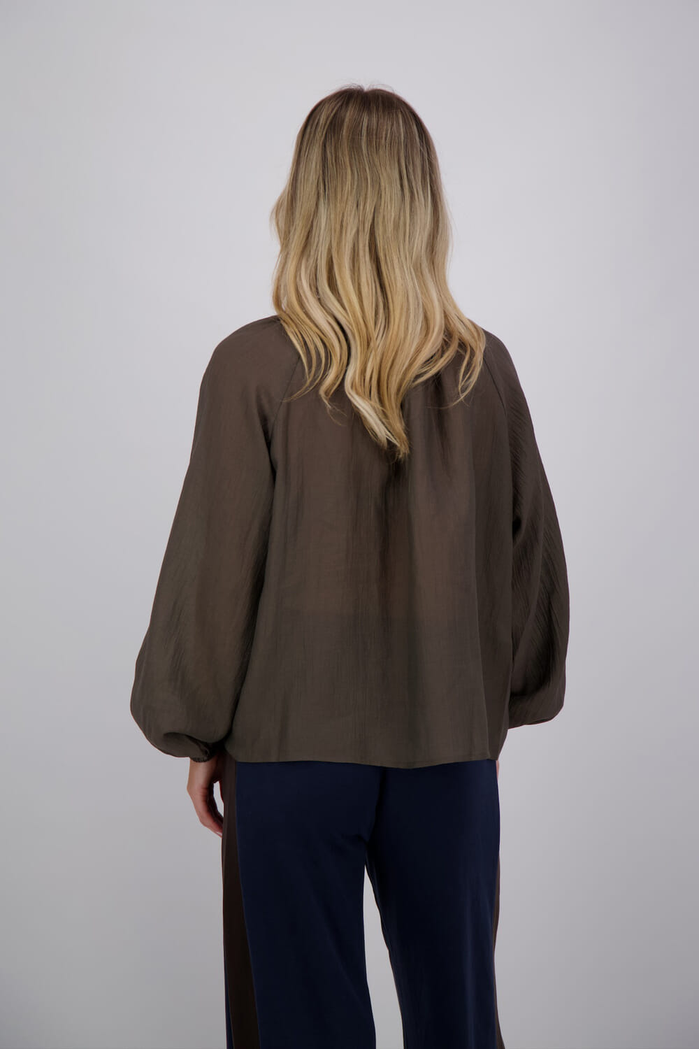 De Blouse Peer van Aimée the label is een casual blouse met een losse pasvorm, ronde halslijn en lange mouwen met elastische manchetten. Het effen patroon en de knoopsluiting maken het perfect voor een minimalistische stijl. Ideaal voor een ontspannen, modieuze uitstraling.