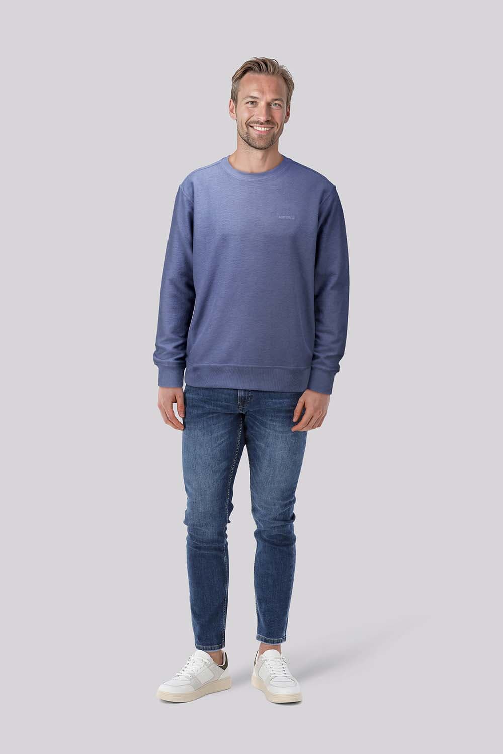 Sweater milo van Airforce is een t-shirt met casual uitstraling, ronde hals, lange mouwen met ribgebreide mouwboorden en een regular pasvorm. Het effen ontwerp in blauwgrijs krijgt een subtiel logo op de borst, ideaal voor ontspannen dagen en makkelijke combinaties.