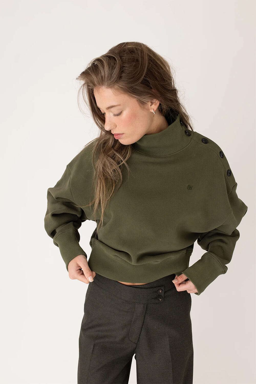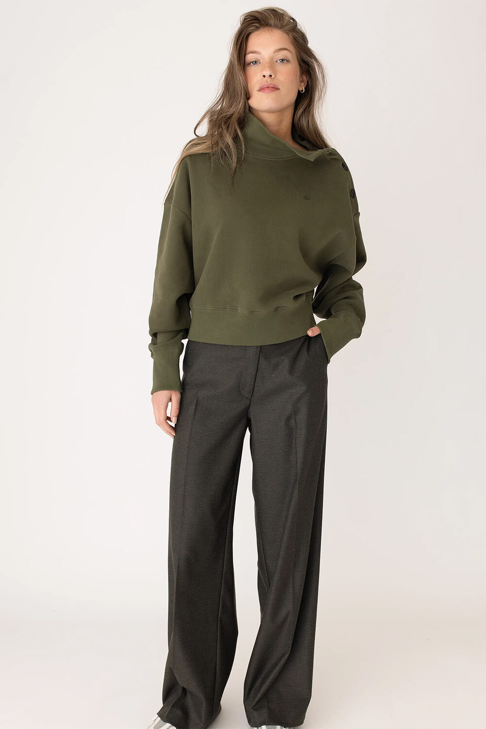 De Anna Blue sweater combineert casual stijl met een opstaande kraag en ribgebreide mouwboorden. Het heeft een relaxed fit en lange mouwen, perfect voor een comfortabele look. De effen kleur en knoopdetails maken deze sweater een veelzijdige keuze voor iedere gelegenheid.