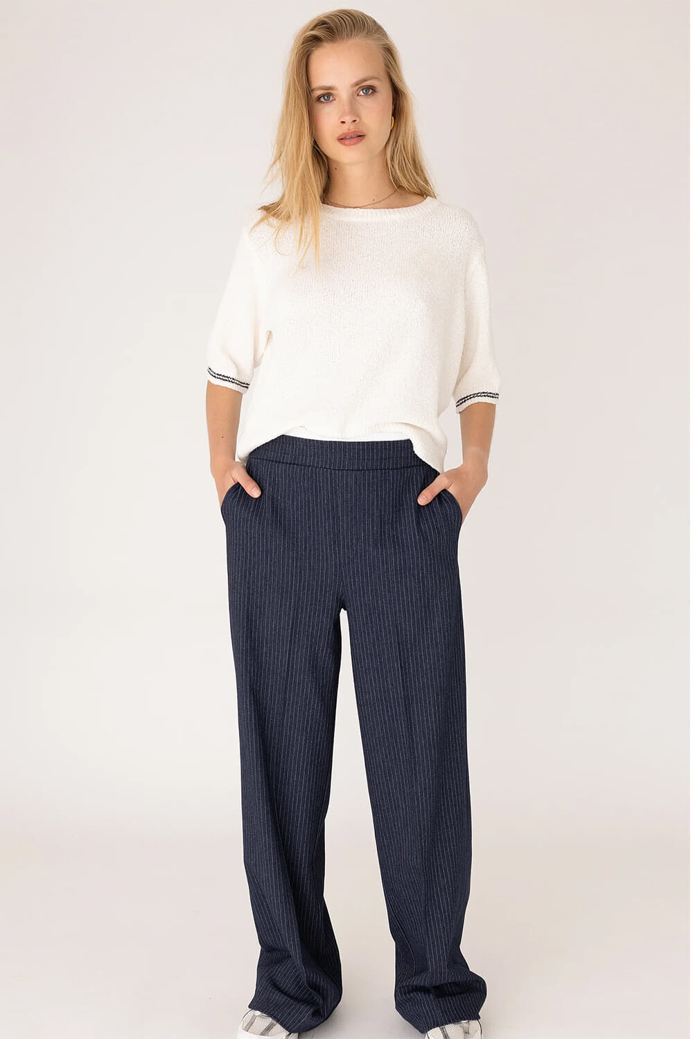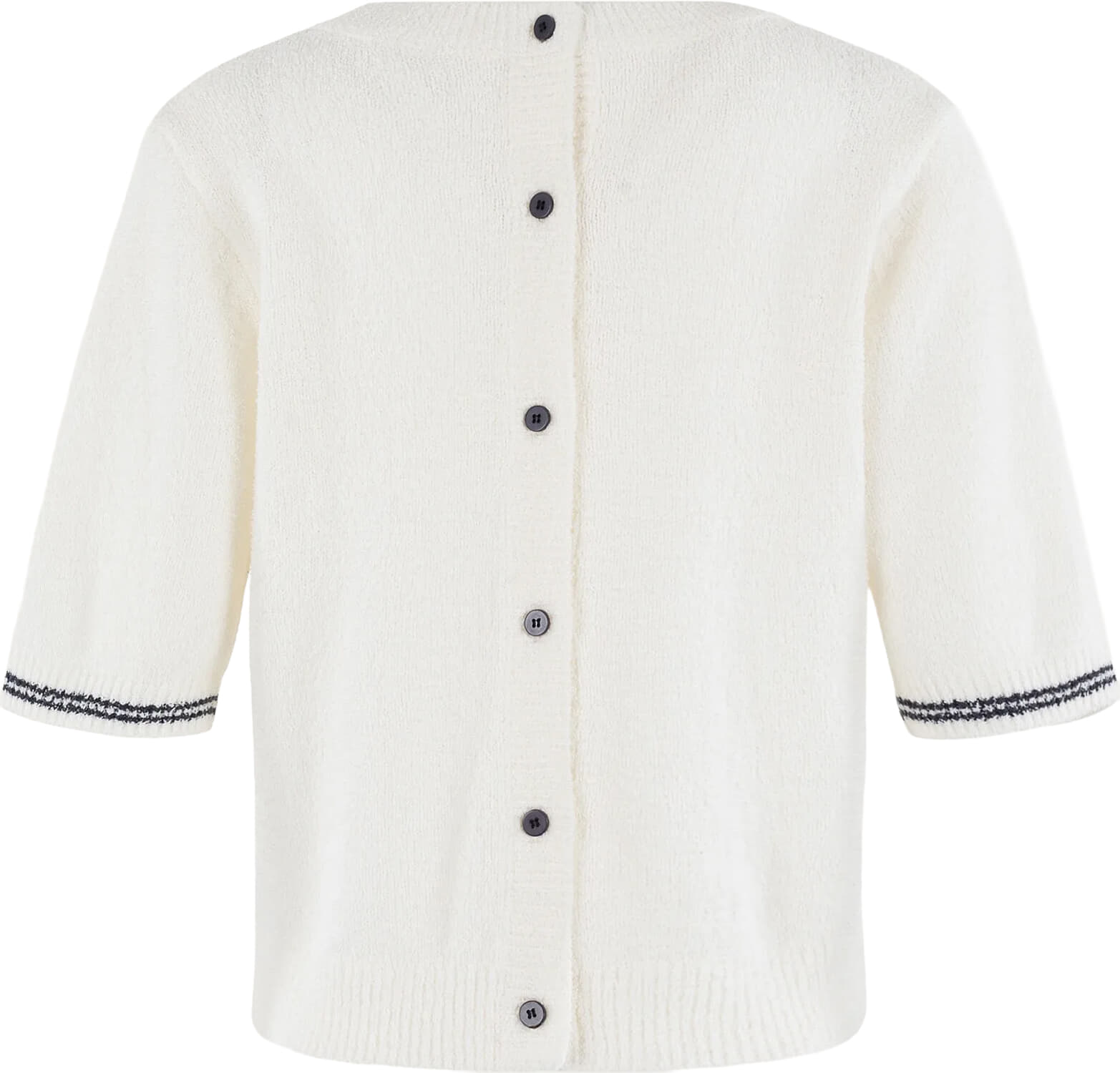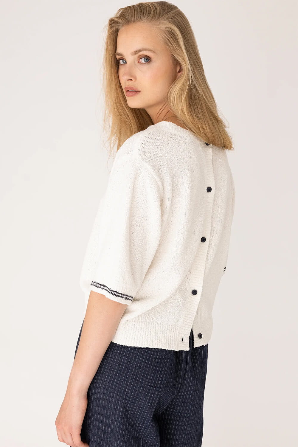 Trui Oleta van Anna Blue is een casual, minimalistische trui met regular pasvorm, ronde hals en korte mouwen. De effen, zachte boucléstructuur krijgt detail door ribgebreide boorden en een knoopsluiting achter. Draag los op een jeans of half ingestopt in een pantalon.
