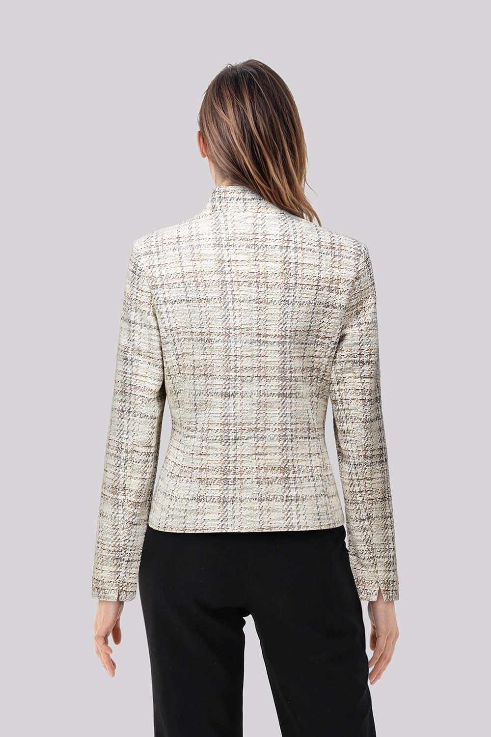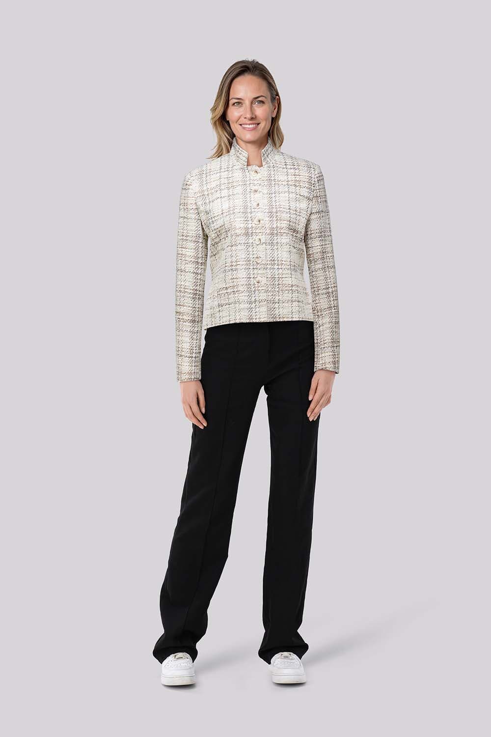 De Blazer Juliet van B Three is een verfijnde blazer met knoopsluiting en opstaande kraag. Met een getailleerde pasvorm en lange mouwen biedt deze blazer een nette uitstraling. Het ruitenpatroon voegt een modieuze touch toe, perfect voor elke gelegenheid waar stijl voorop staat.