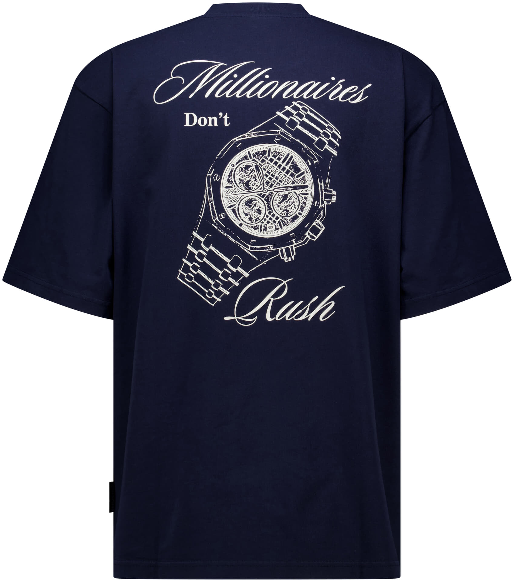 T-Shirt van Baron Filou met ronde hals en korte mouwen, gemaakt voor casual dagen. Het donkerblauwe model heeft een klein logo op de borst en een grote grafische print met horloge en tekst op de rug. Draagt prettig en combineert makkelijk met jeans of chino.