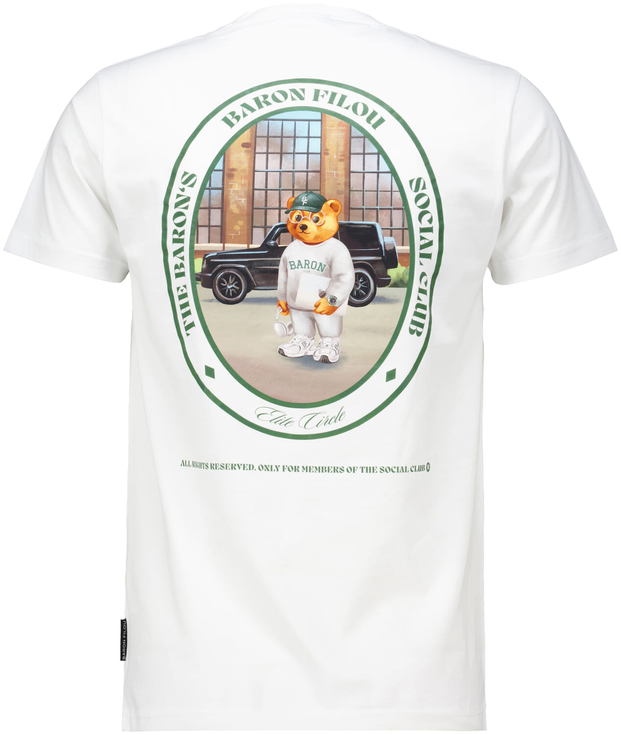 Dit casual heren T-shirt van Baron Filou heeft een ronde hals en korte mouwen. Het grafische patroon op de achterkant voegt een speelse touch toe. Ideaal voor alledaagse gelegenheden, biedt het comfort en stijl in één, perfect voor elke garderobe.