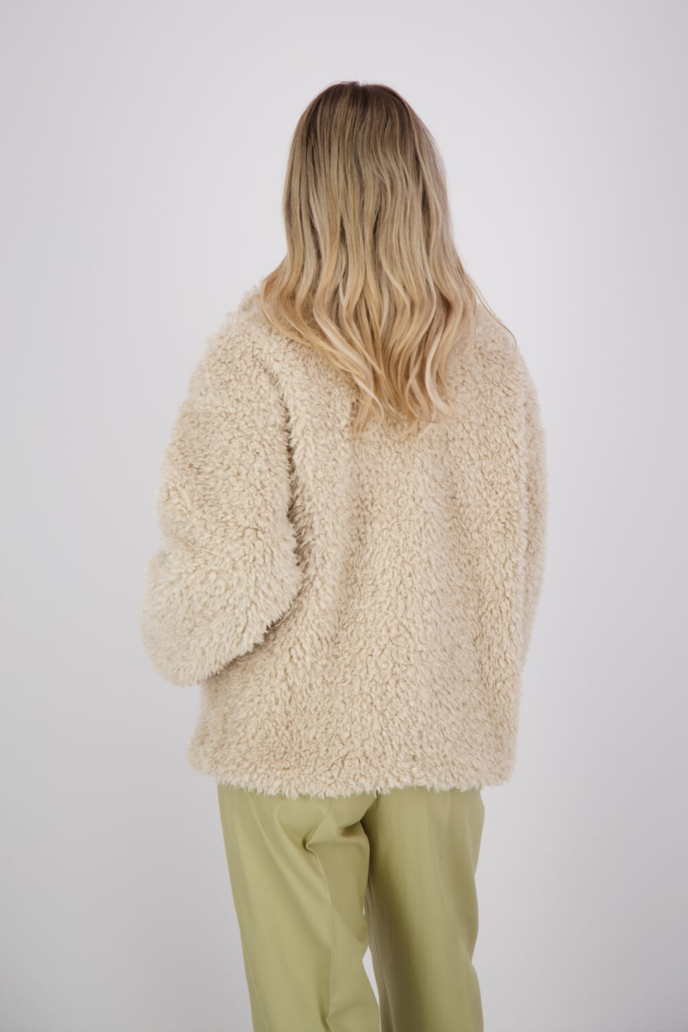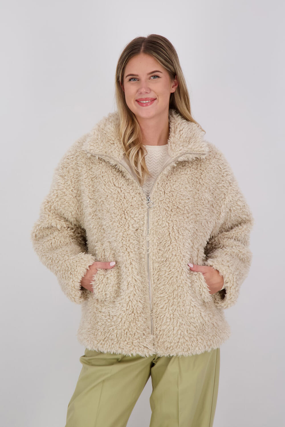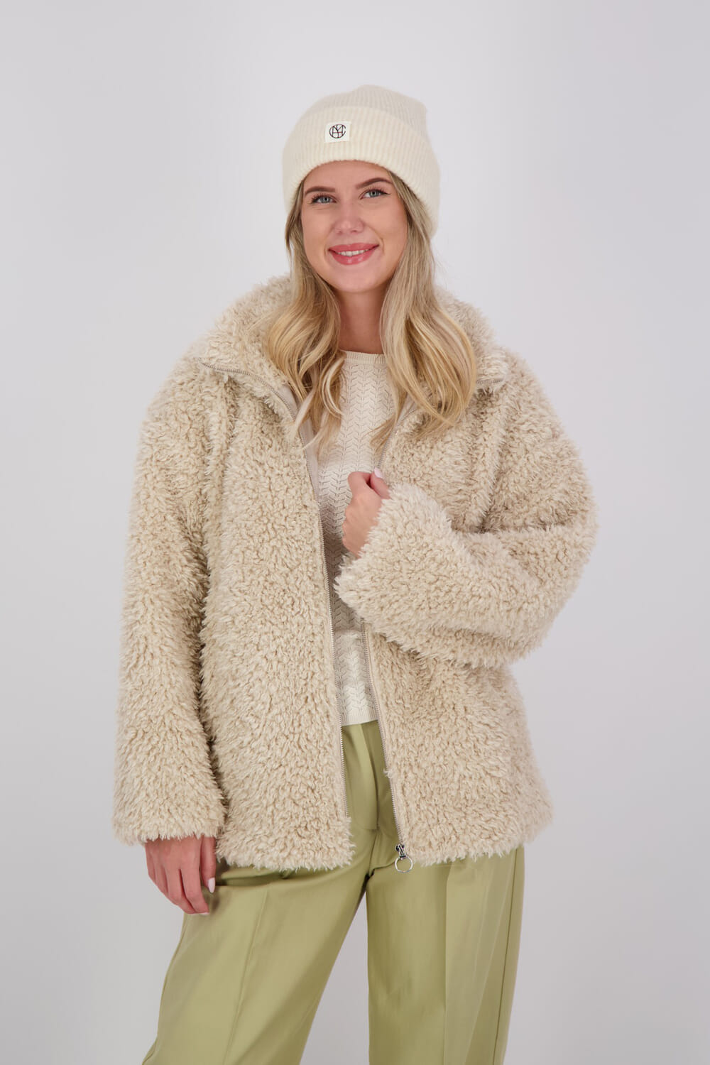 Beige jas van Freequent met een groene pantalon van Selected Femme