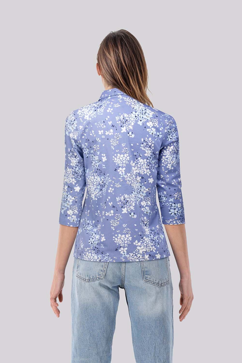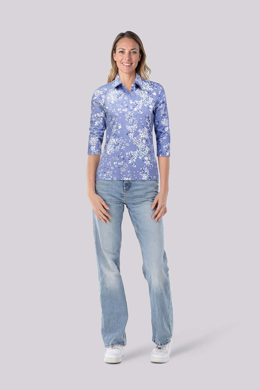 Polo, dames polo van Bloomings met bloemendessin en frisse blauwtint. Casual overhemdstijl met spreidkraag, overhemdkraag halslijn en knoopsluiting. Regular pasvorm en lange mouwen zorgen voor comfortabel dragen, ideaal voor ontspannen momenten met een verzorgde uitstraling.