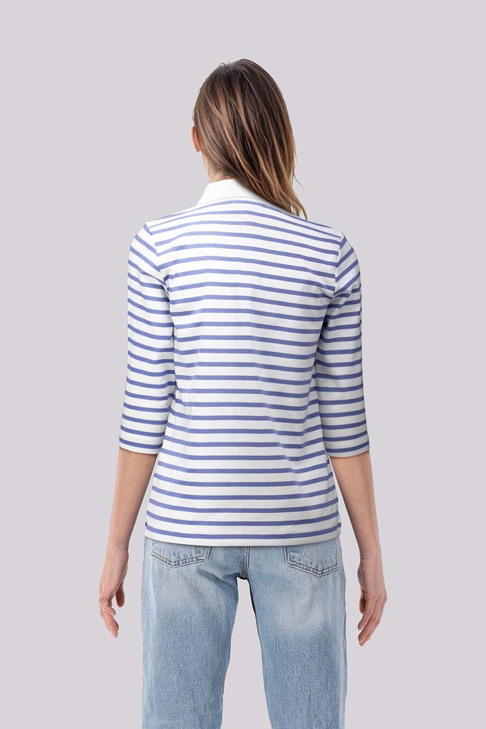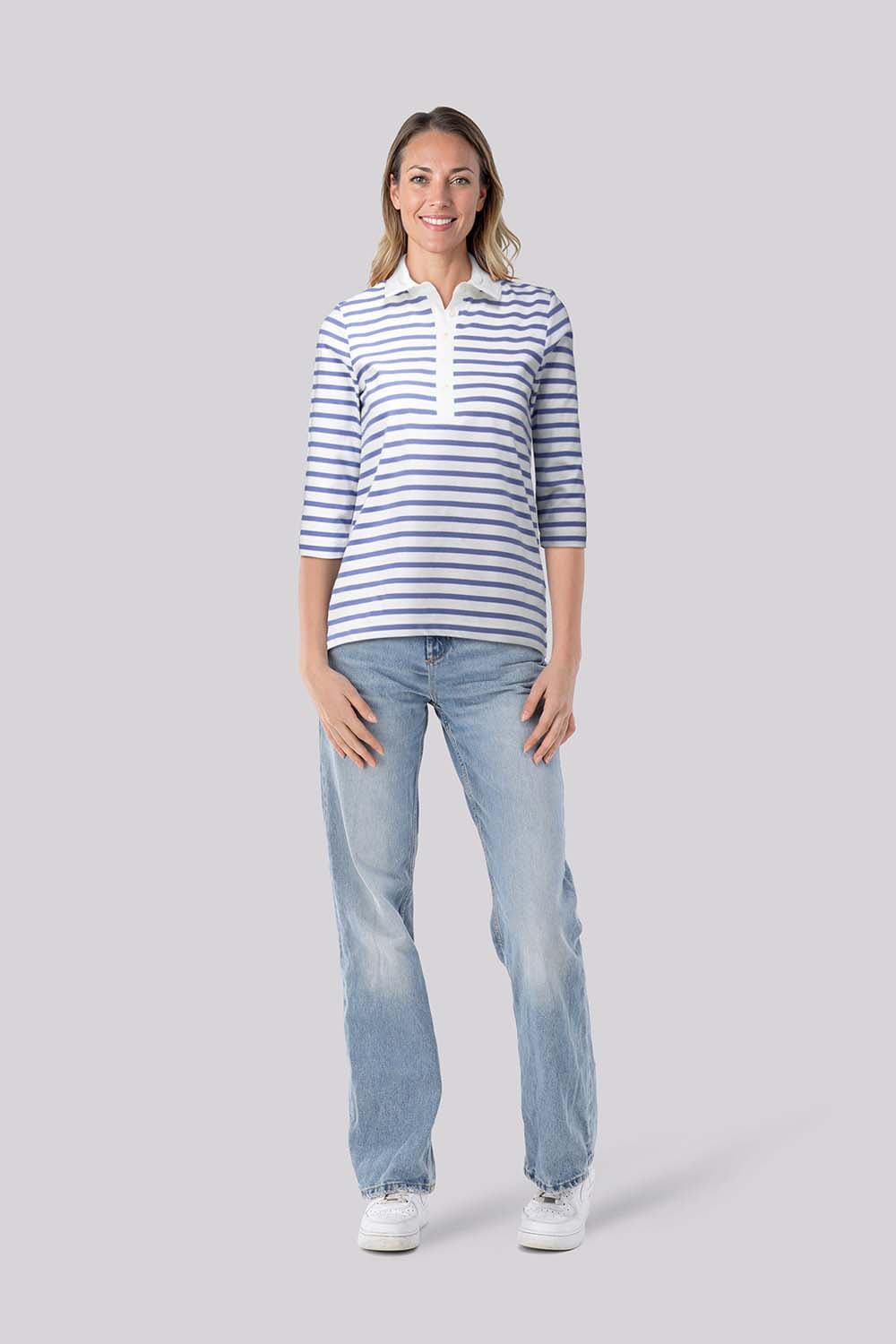Polo dames polo van Bloomings met streeppatroon, polokraag en knoopsluiting. De regular pasvorm draagt comfortabel en valt netjes, terwijl de 3 kwart mouwen zorgen voor bewegingsvrijheid. De lichte, frisse kleurencombinatie maakt dit casual model makkelijk te combineren met jeans, chino of rok.