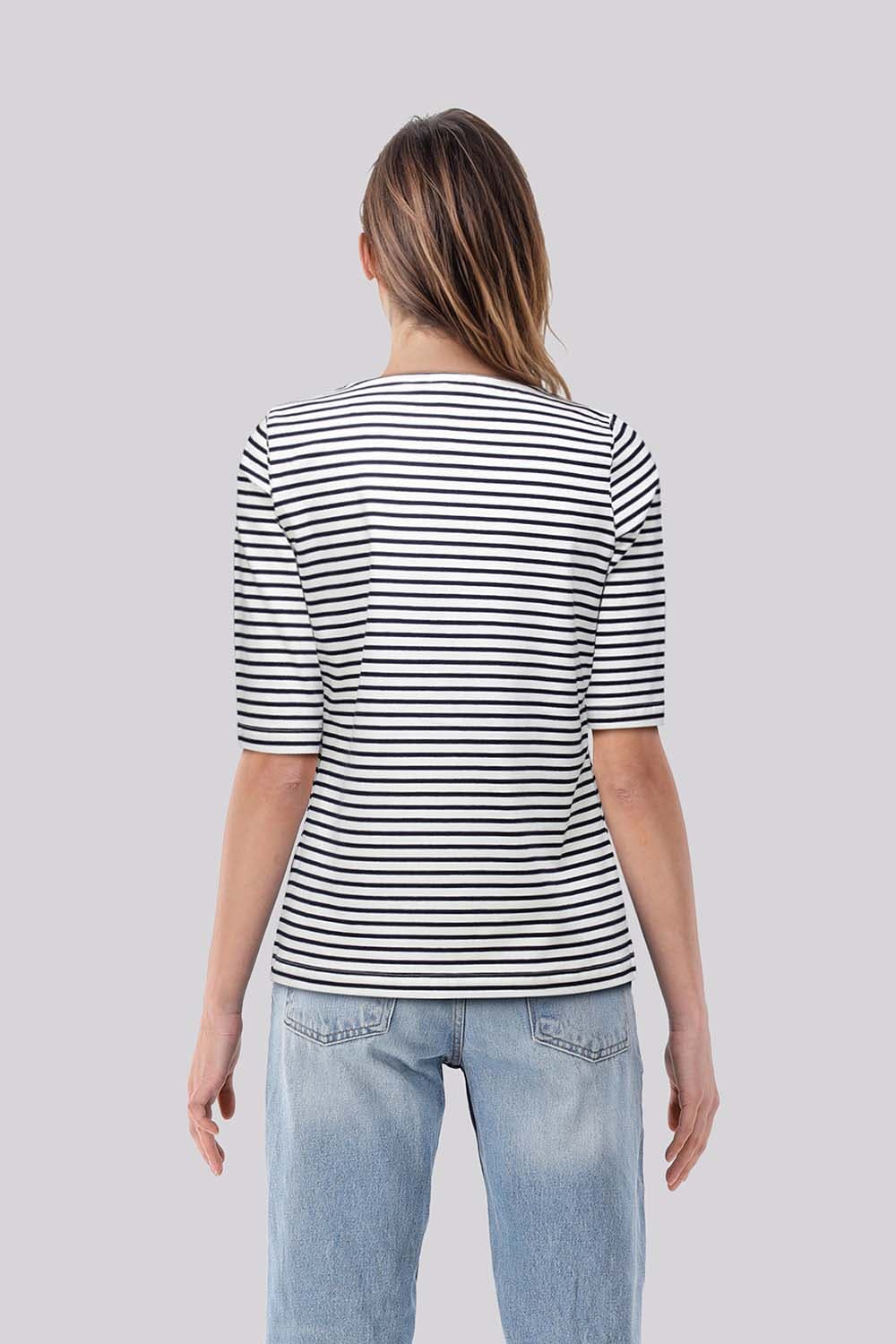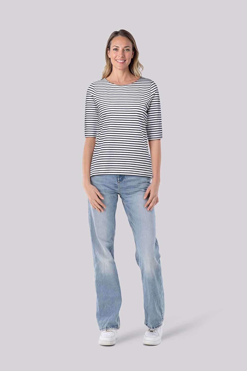 T shirt van Bloomings met ronde hals, regular pasvorm en 3/4 mouwen. Het streeppatroon in fris groen op een lichte basis geeft een casual uitstraling, terwijl de rechte zoom en comfortabele snit zorgen voor makkelijk combineren bij elke ontspannen gelegenheid.