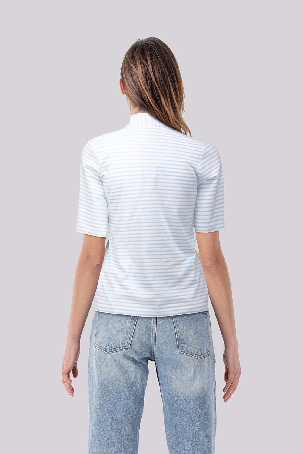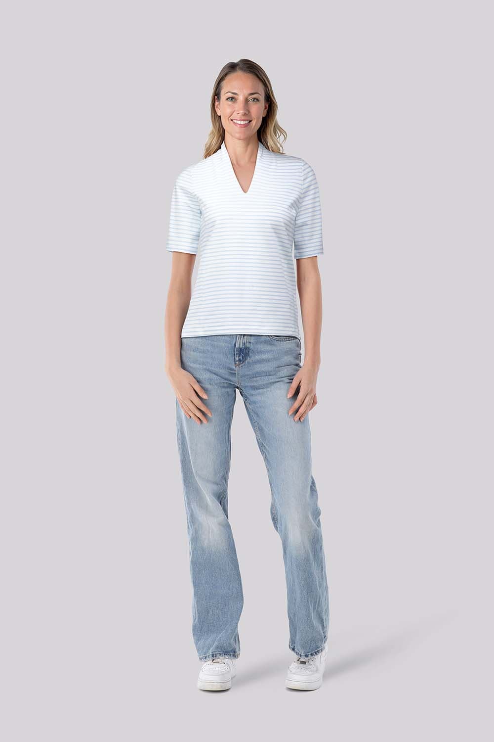 Top van Bloomings, top korte mouw met V-hals, regular pasvorm en casual uitstraling. Het streeppatroon in lichtblauw en wit geeft een frisse touch, terwijl de korte mouwen en de nette halsafwerking zorgen voor een comfortabele, verzorgde fit voor elke dag.