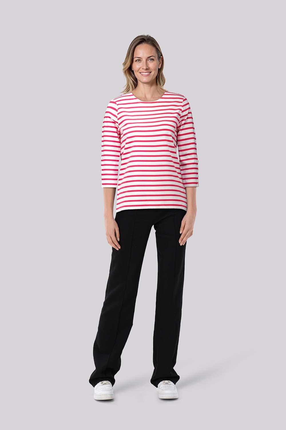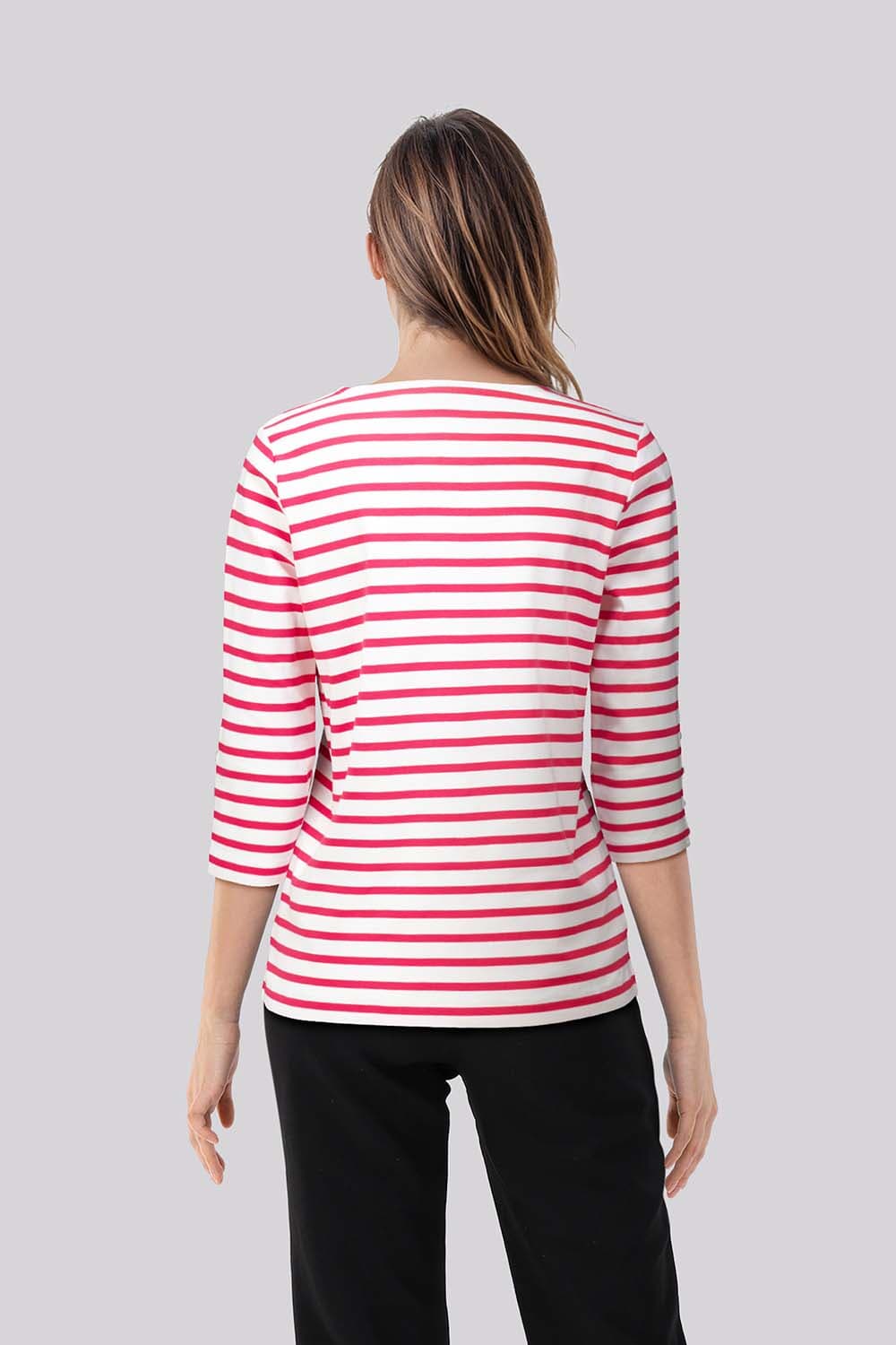Top lange mouw van Bloomings is een top lange mouw met ronde hals, regular pasvorm en 3/4 mouwen met knoopdetail. Het streeppatroon in donkerblauw en wit geeft een frisse, casual uitstraling, ideaal voor ontspannen momenten en eenvoudig te combineren met jeans of een rok.