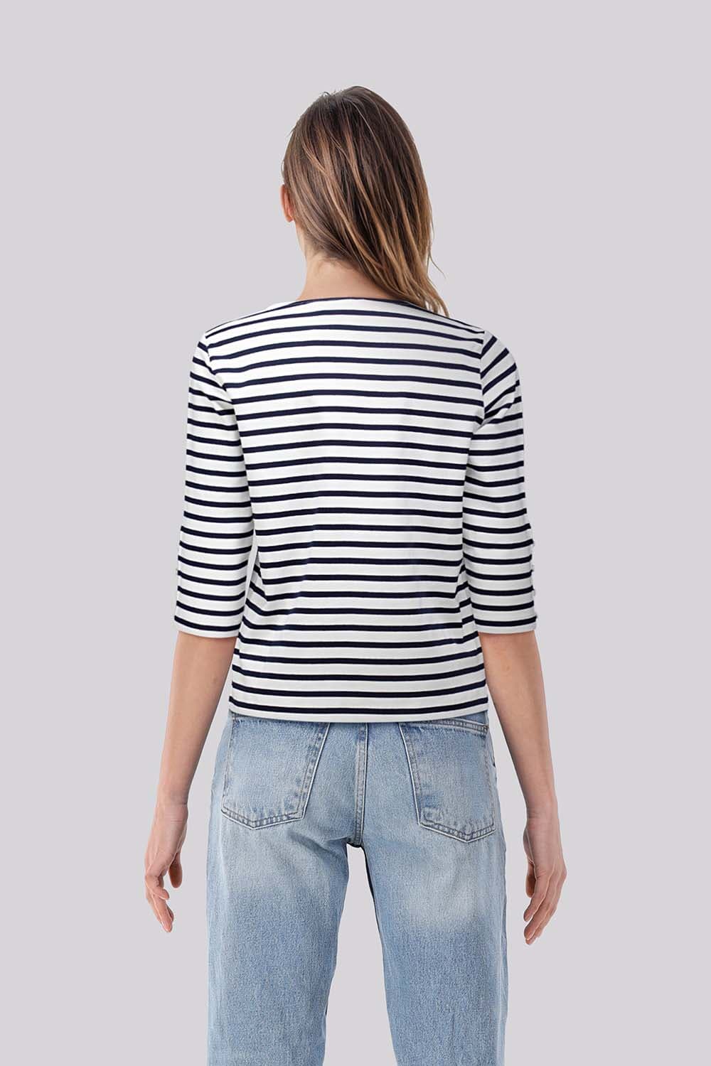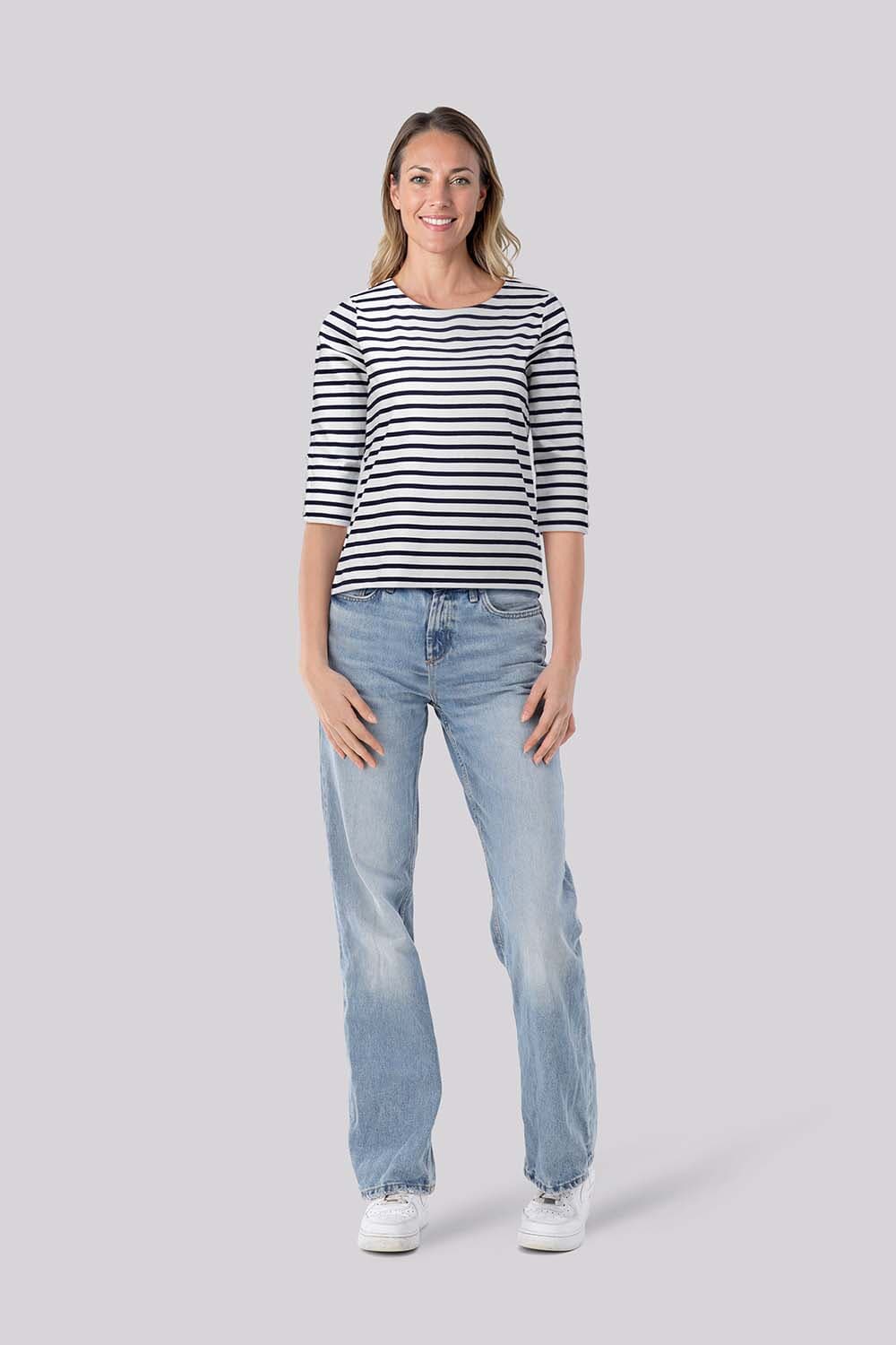 Top lange mouw van Bloomings is een top lange mouw met ronde hals, regular pasvorm en 3/4 mouwen met knoopdetail. Het streeppatroon in donkerblauw en wit geeft een frisse, casual uitstraling, ideaal voor ontspannen momenten en eenvoudig te combineren met jeans of een rok.