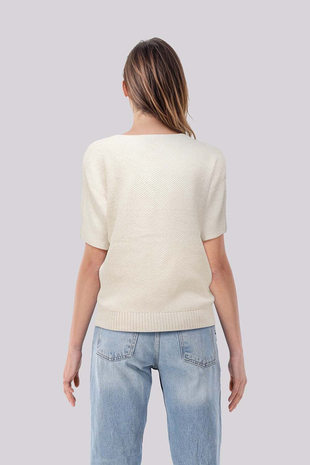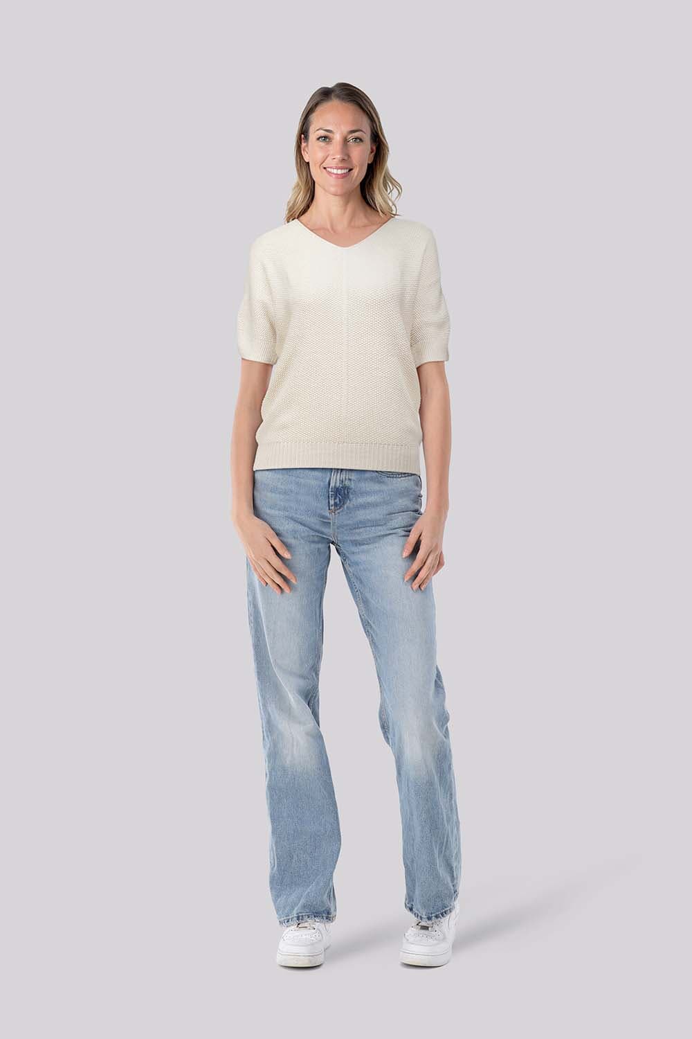 Trui uit truien van Bloomings met V-hals, 1/2 mouwen en een regular, losse pasvorm. De effen knit heeft een opengebreide structuur, een subtiele middennaad en een geribde zoom en manchetten, ideaal voor een casual, minimalistische stijl.