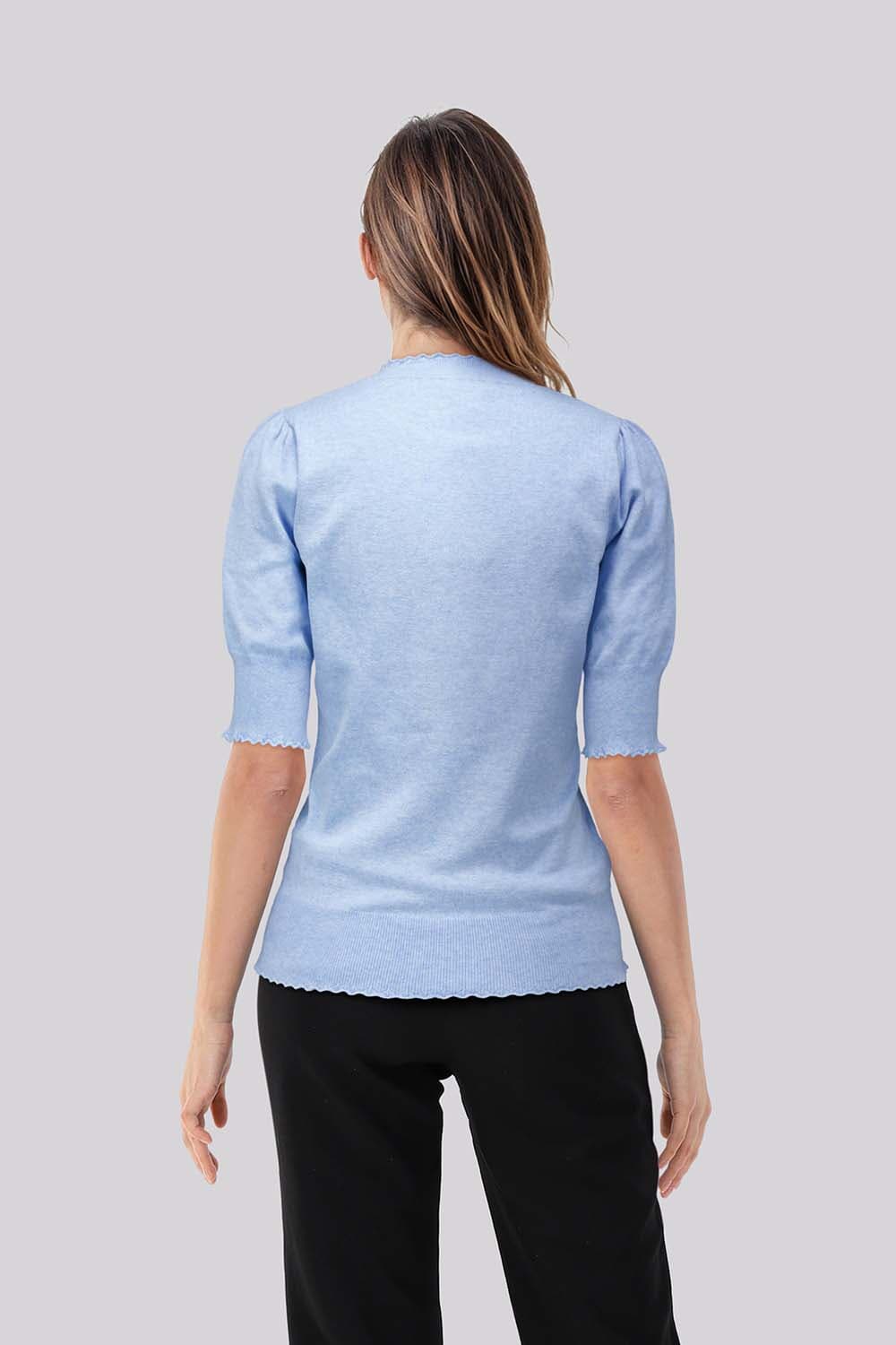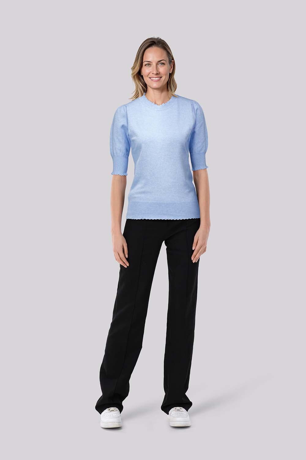 Trui van Bloomings uit de categorie truien, met ronde hals, korte mouwen en regular pasvorm. Het effen breisel heeft een fijn, glad oppervlak, een bredere ribboord aan de zoom en subtiele geschulpte randen bij hals, mouwen en onderkant, voor een vrouwelijke, casual uitstraling.