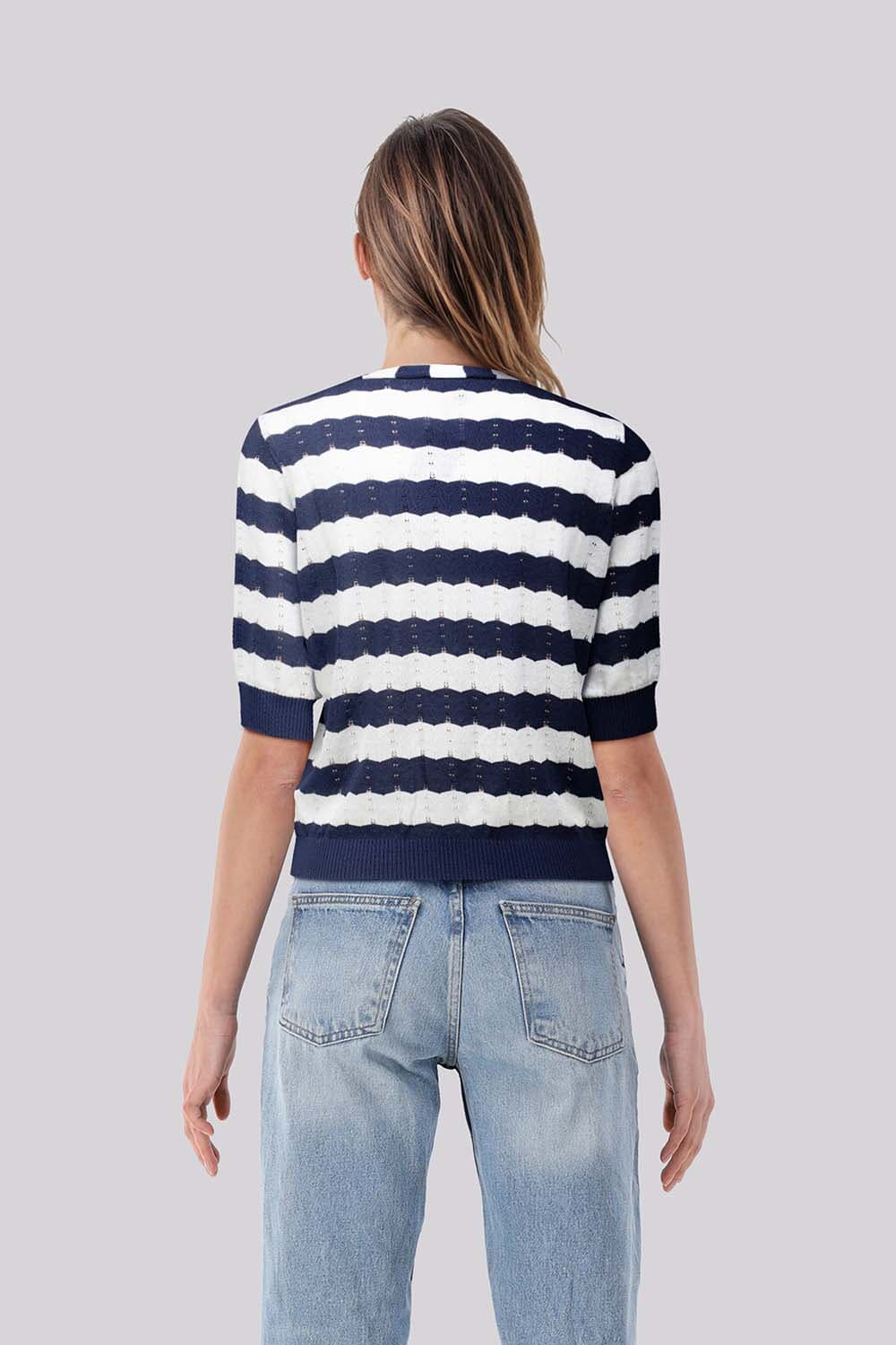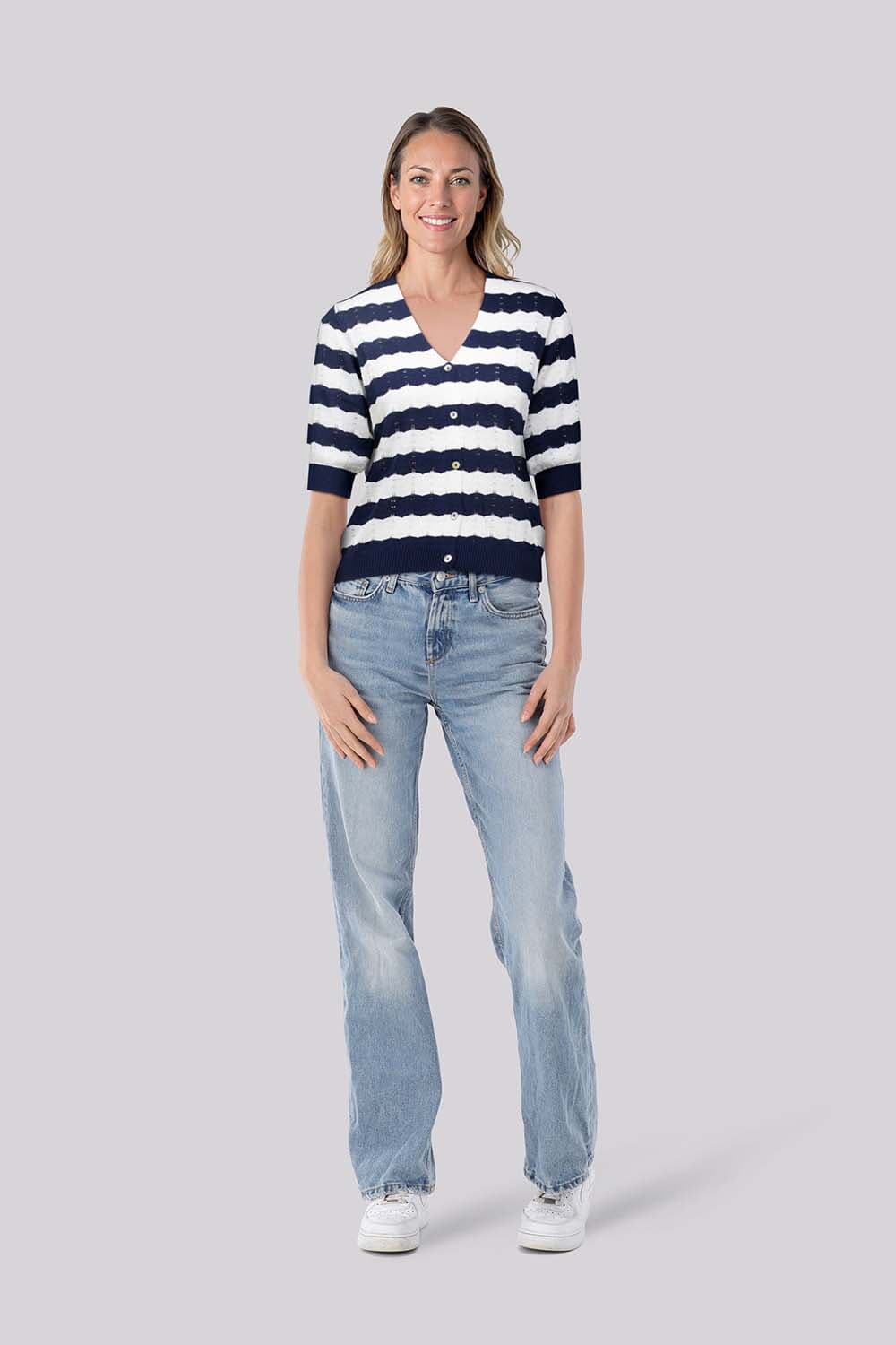Vest Bloomings met casual uitstraling, V-hals en knoopsluiting. Het streeppatroon in donkerblauw en wit geeft een helder accent. De regular pasvorm en lange mouwen dragen comfortabel. De opengewerkte breistructuur voegt luchtigheid toe. Combineer met een effen top en jeans voor een rustige balans.