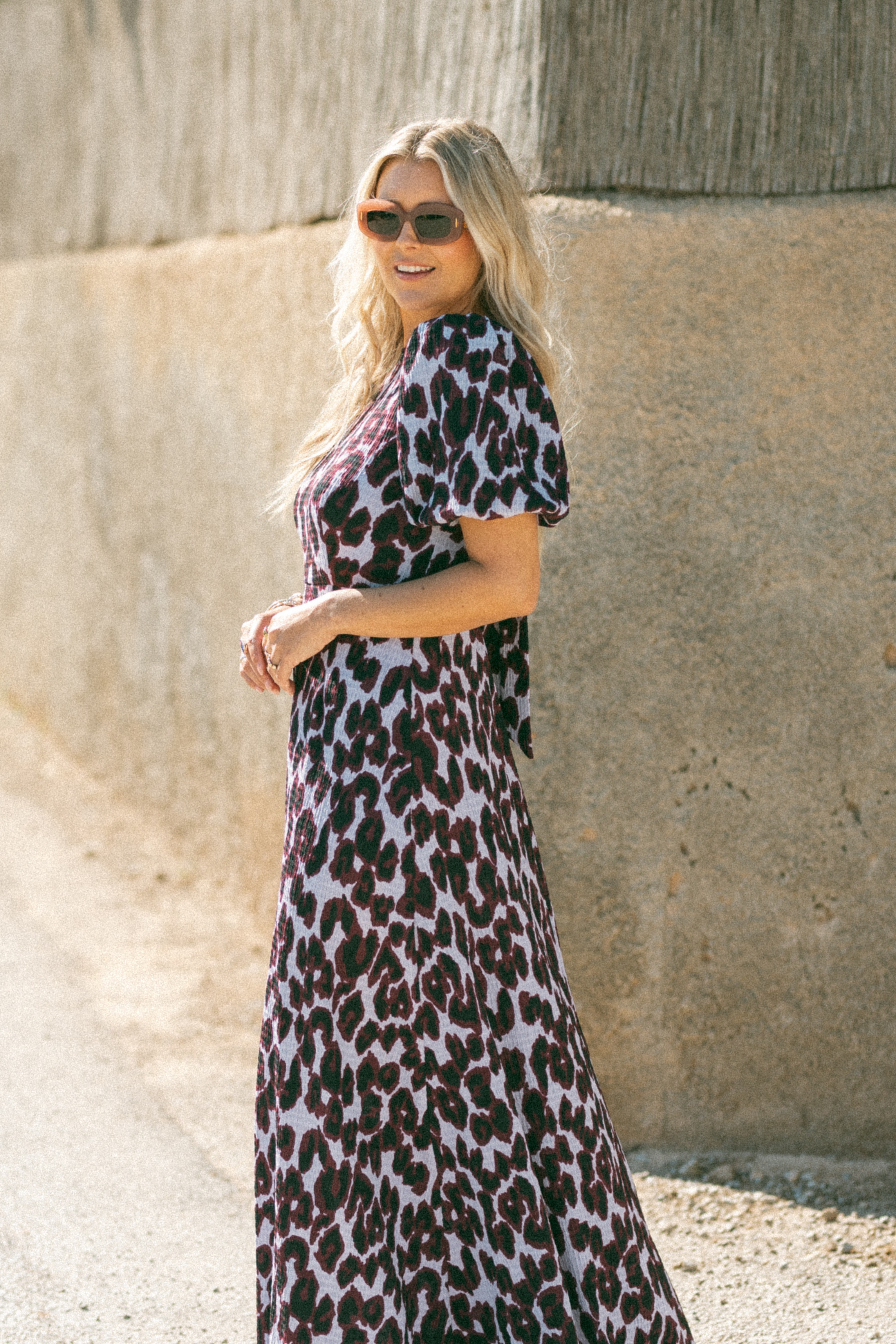 De Lolita is terug! De print combineert lila, aubergine en donkerpaars voor een trendy, vrouwelijke uitstraling. De jurk sluit met een strik aan de achterkant, waardoor je bh-bandje niet zichtbaar is. In de taille sluit de jurk mooi aan en de speelse pofmouw geeft een extra detail. Een stijlvolle en comfortabele keuze met een unieke print.