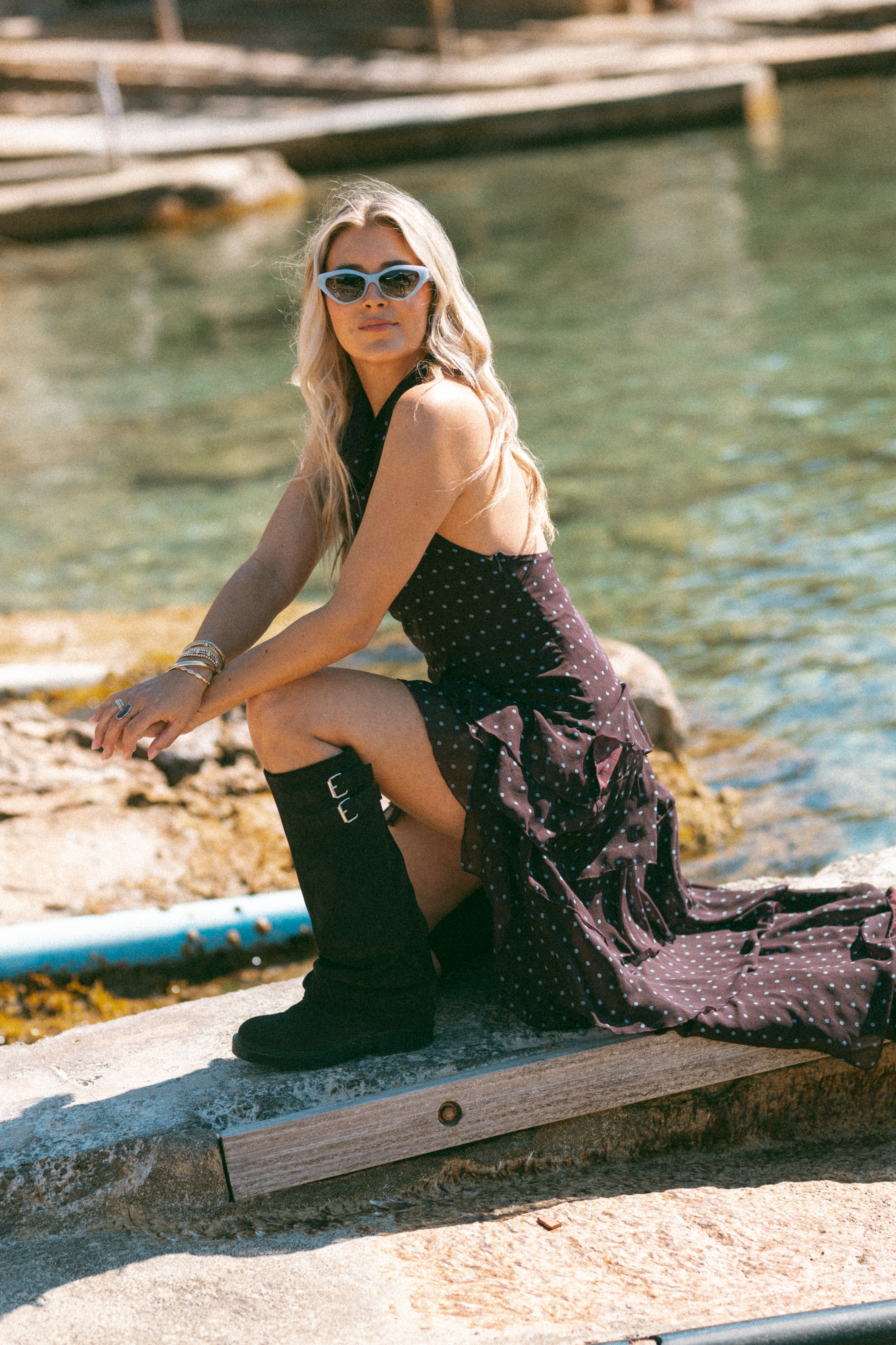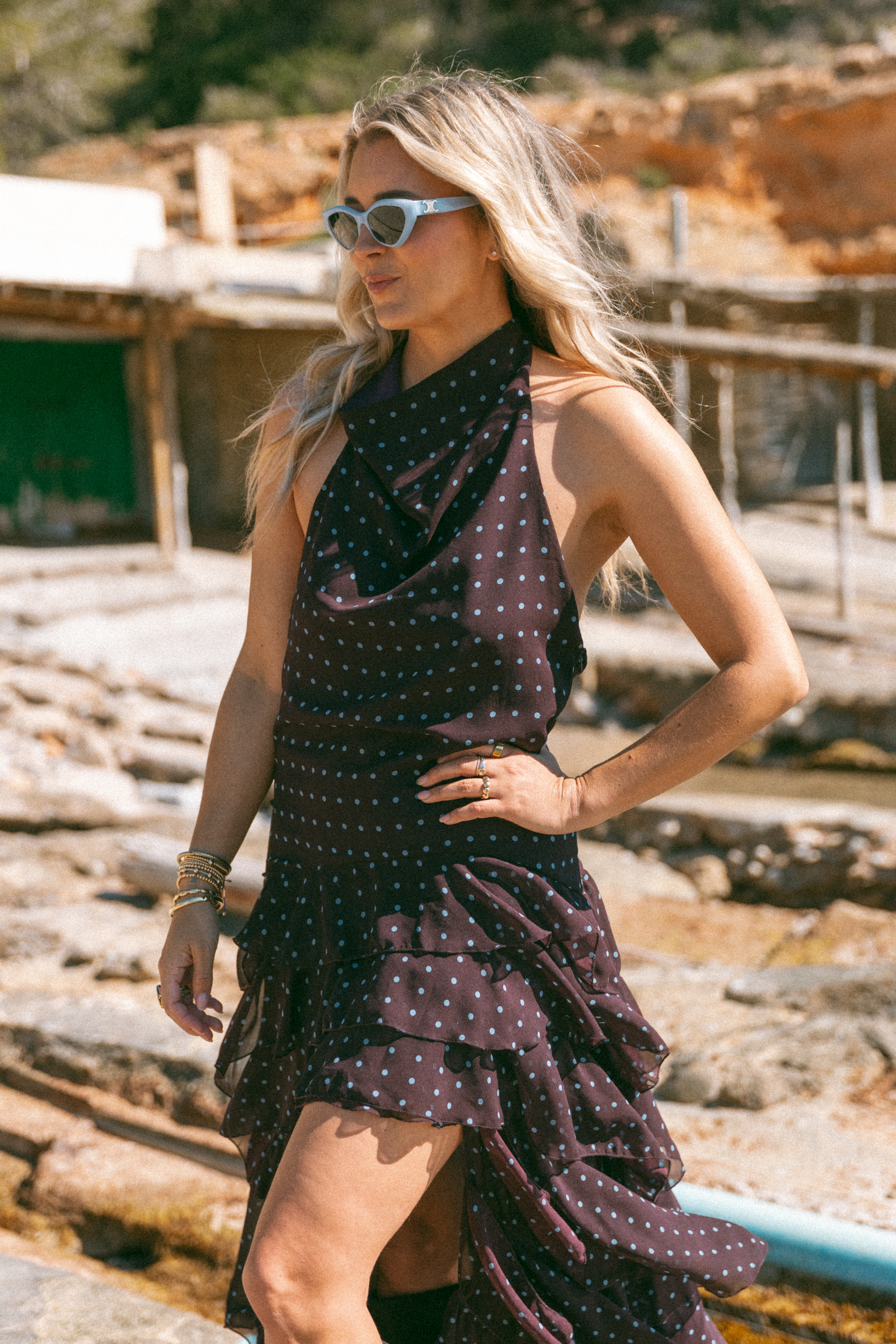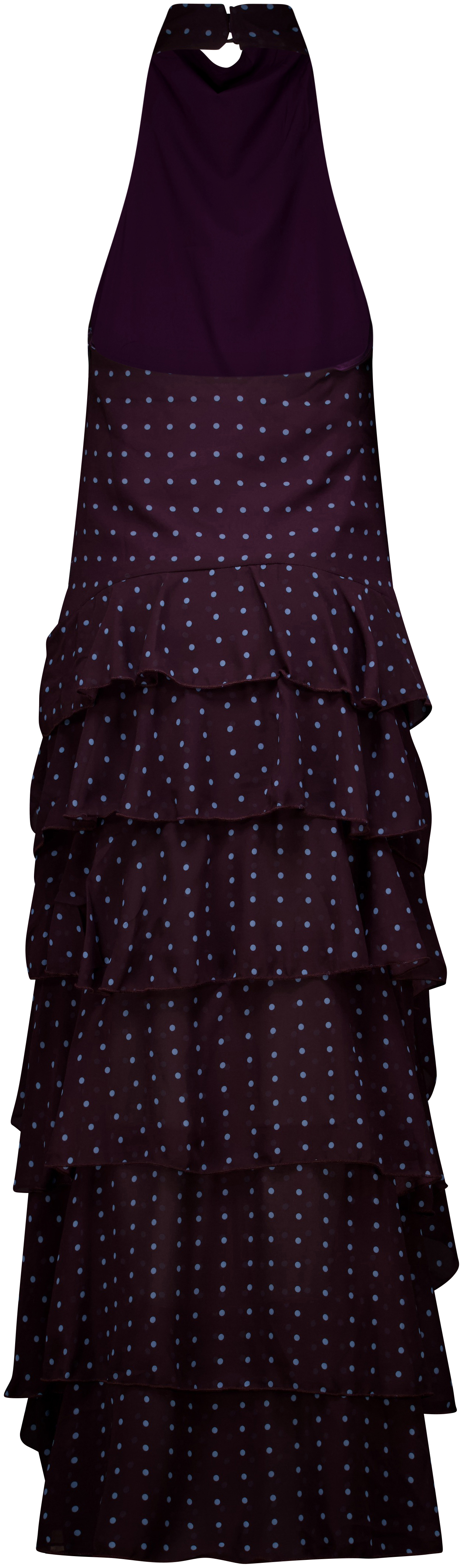 Geïnspireerd op de Spaanse jurk, maar met een moderne twist: de Señorita dress. De blauwe polkadot en roezels zorgen voor een speels en vrouwelijk effect. De jurk heeft een open rug en sluit met knoopjes in de nek. Dankzij de voering en auberginekleur is het niet nodig om een bh te dragen. Een vrouwelijke look met een subtiele stoere knipoog.