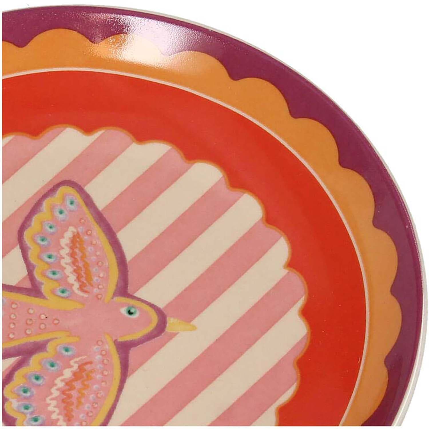 Bord Bird van Bomont Collection is servies van aardewerk met een bohemian uitstraling. Het ronde bord heeft een speels streeppatroon en een vogel met dierenprint. Handig voor taart, tapas of een klein ontbijt. Combineer met rustig servies.