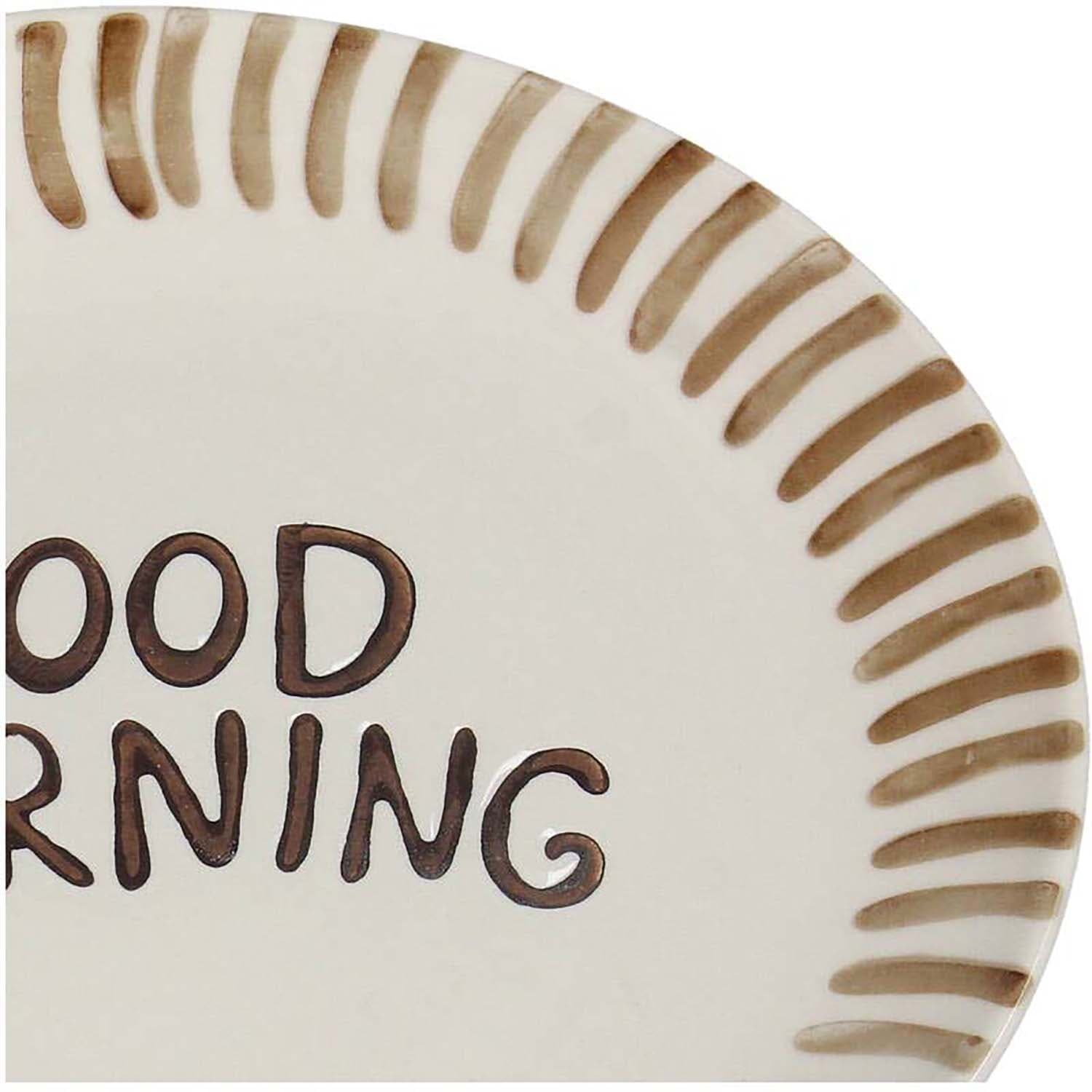 Bord Good Morning 20.5x20.5x2.8 Cm van Bomont Collection KT is servies/aardewerk met een grafisch patroon en handgeschreven tekst. De opstaande rand met penseelstreken geeft grip bij serveren. Vierkant formaat, afgeronde hoeken. Combineert makkelijk met mokken en schaaltjes voor een casual gedekte tafel.