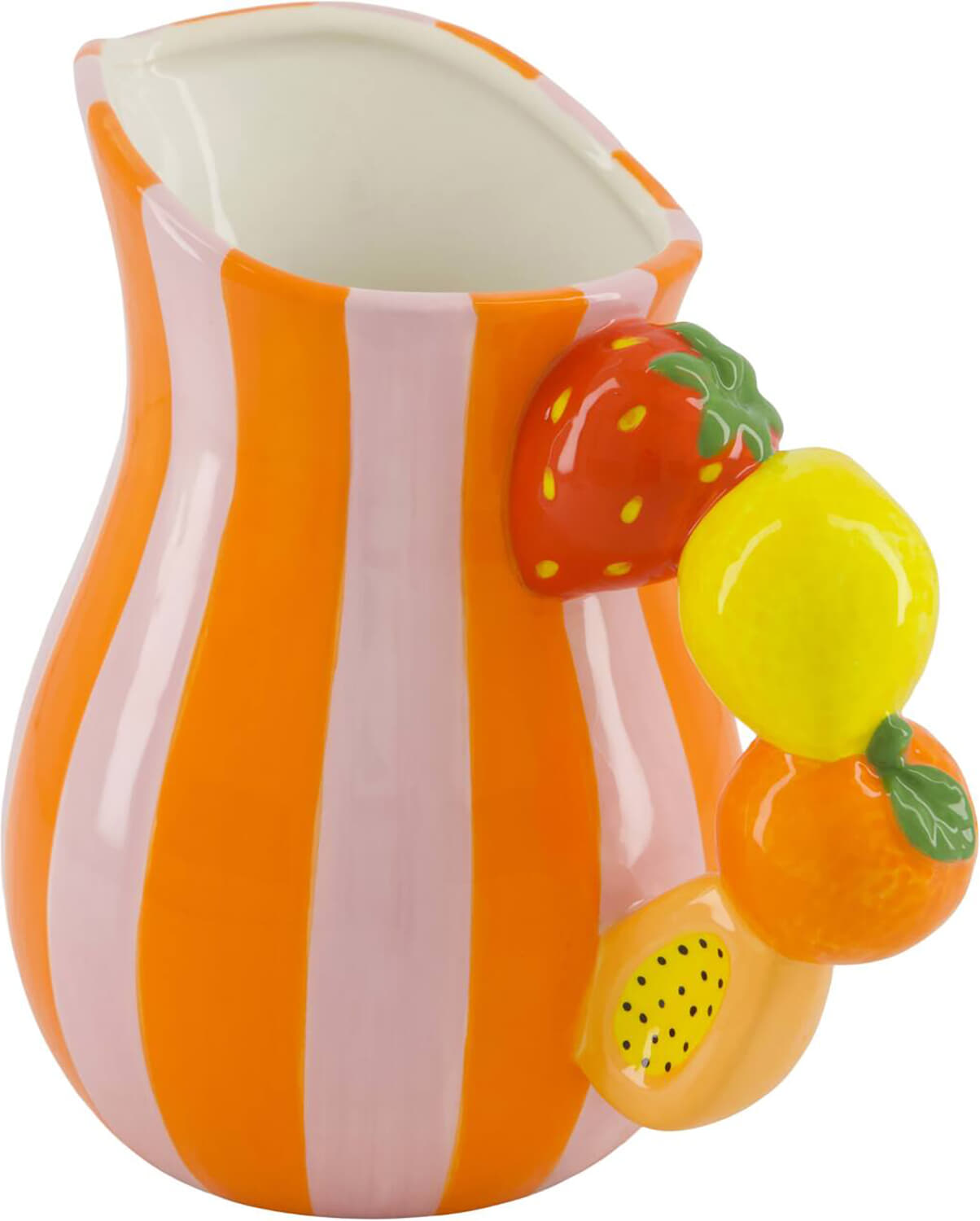 Carafe fruit ceramic with handle 18x12x18cm van Bomont Collection Dk brengt bohemian, casual sfeer op tafel. De keramische kan heeft een gestreept, all-over patroon, een stevige greep met fruitdetails en een brede schenktuit. Handig voor water, sap of limonade, en mooi als vaas.