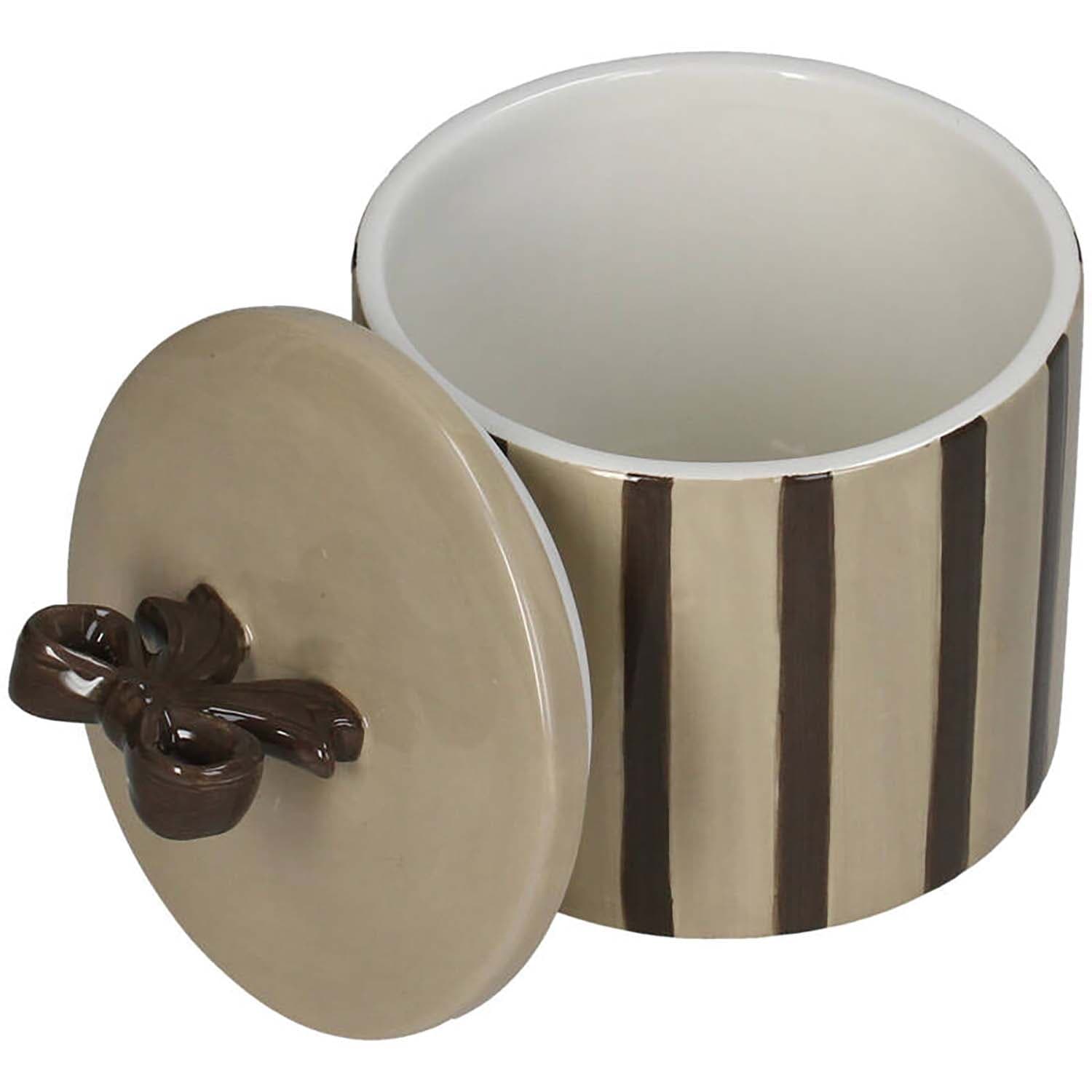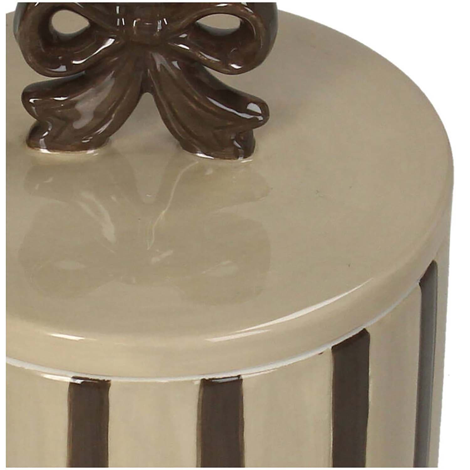 Breng verfijnde charme in huis met dit elegante opbergpotje met deksel. De glanzende afwerking, verticale strepen en het strikdetail geven een vrouwelijke, sophisticated uitstraling. Ideaal om sieraden, wattenstaafjes of kleine schatten netjes uit het zicht te bewaren. Het stevige potje voelt luxe aan en staat prachtig op je kaptafel, badkamerplank of nachtkastje. Een subtiel statement dat rust en stijl toevoegt aan je dagelijkse routine.