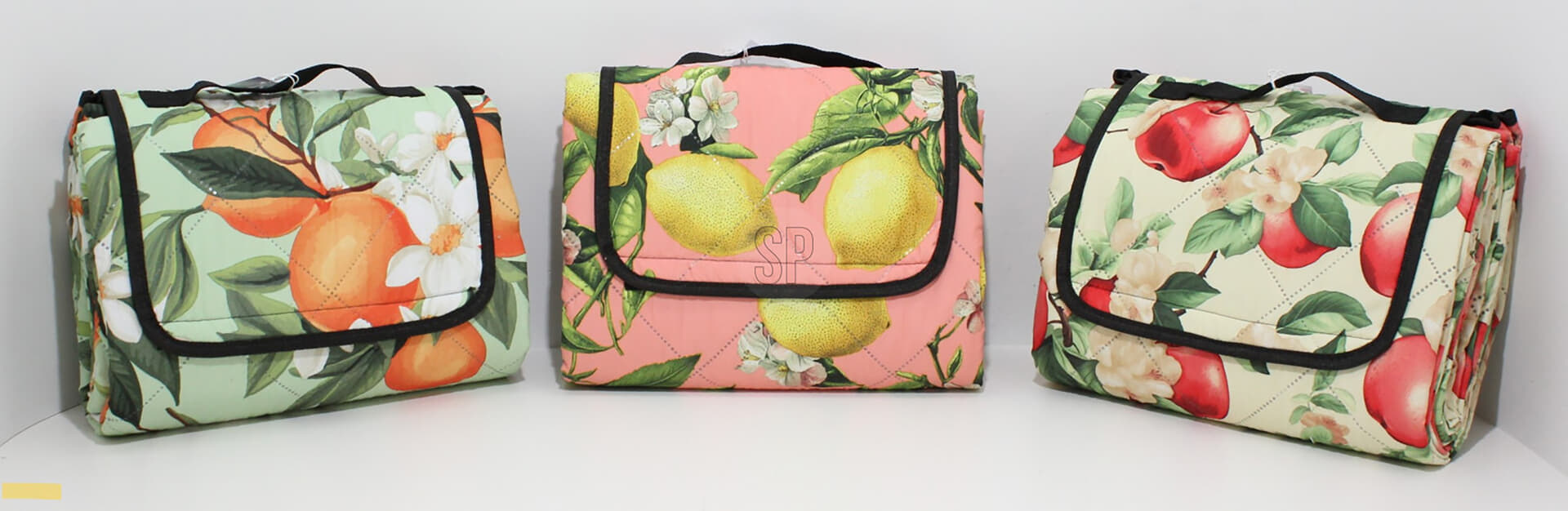 Picknikdeken 115X185cm van Bomont Collection heeft een casual fruit patroon all over. Het gewatteerde plaid vouwt compact, sluit met klep en band, en heeft een draaglus. De waterafstotende onderzijde helpt tegen vocht. Handig voor park, strand of balkon.