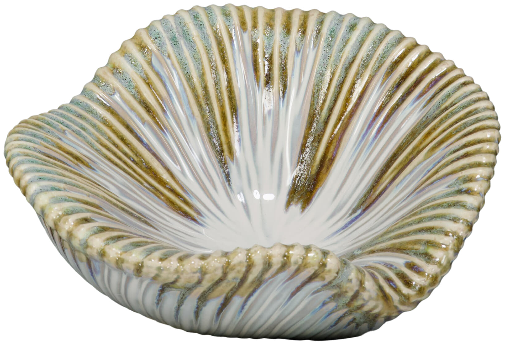 Breng een vleugje luxe in huis met deze stijlvolle schelpschaal. De organische vorm en verfijnde ribbelstructuur vangen het licht prachtig, terwijl de glanzende afwerking met goud- en parelmoertinten een moderne, sophisticated uitstraling geeft. Perfect als decoratief statement op tafel, dressoir of in de hal, en ideaal om kleine essentials elegant te verzamelen. Een subtiel kunstobject dat rust en klasse toevoegt aan elke ruimte.