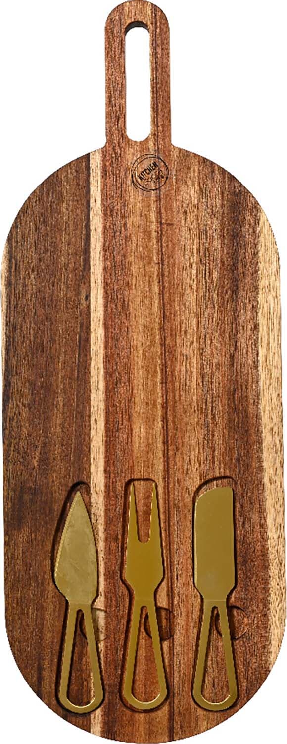 Deze houten snijplak van Bomont is een stijlvolle accessoire met een effen patroon. De plank is ontworpen met een uitsparing voor drie gouden mesjes, wat zowel praktisch als elegant is voor elke keuken. Zet de borrelhapjes maar klaar!