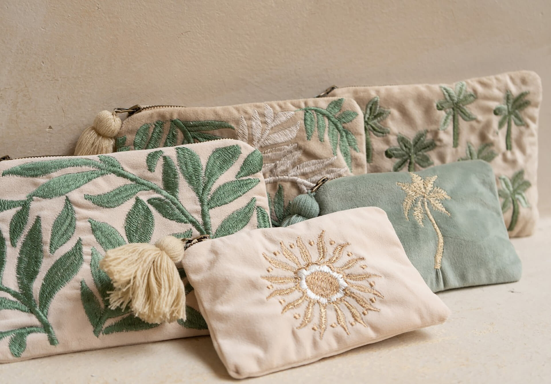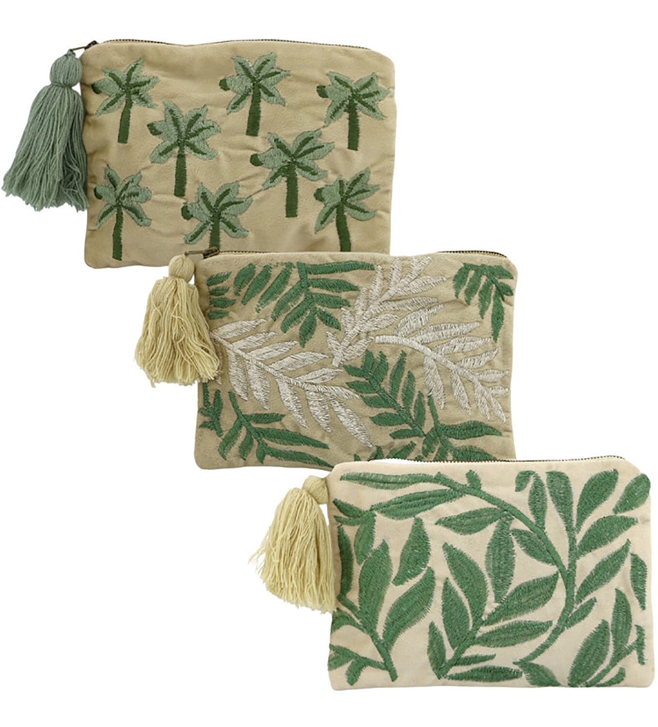 Toilettas Holiday L 3ass van Bomont Collection Jk heeft een bohemian, casual uitstraling met palmboemen en geborduurde bladmotieven. De stevige stof sluit met een rits en heeft een kwastje aan de zijkant. Handig voor verzorgingsproducten, thuis of onderweg.