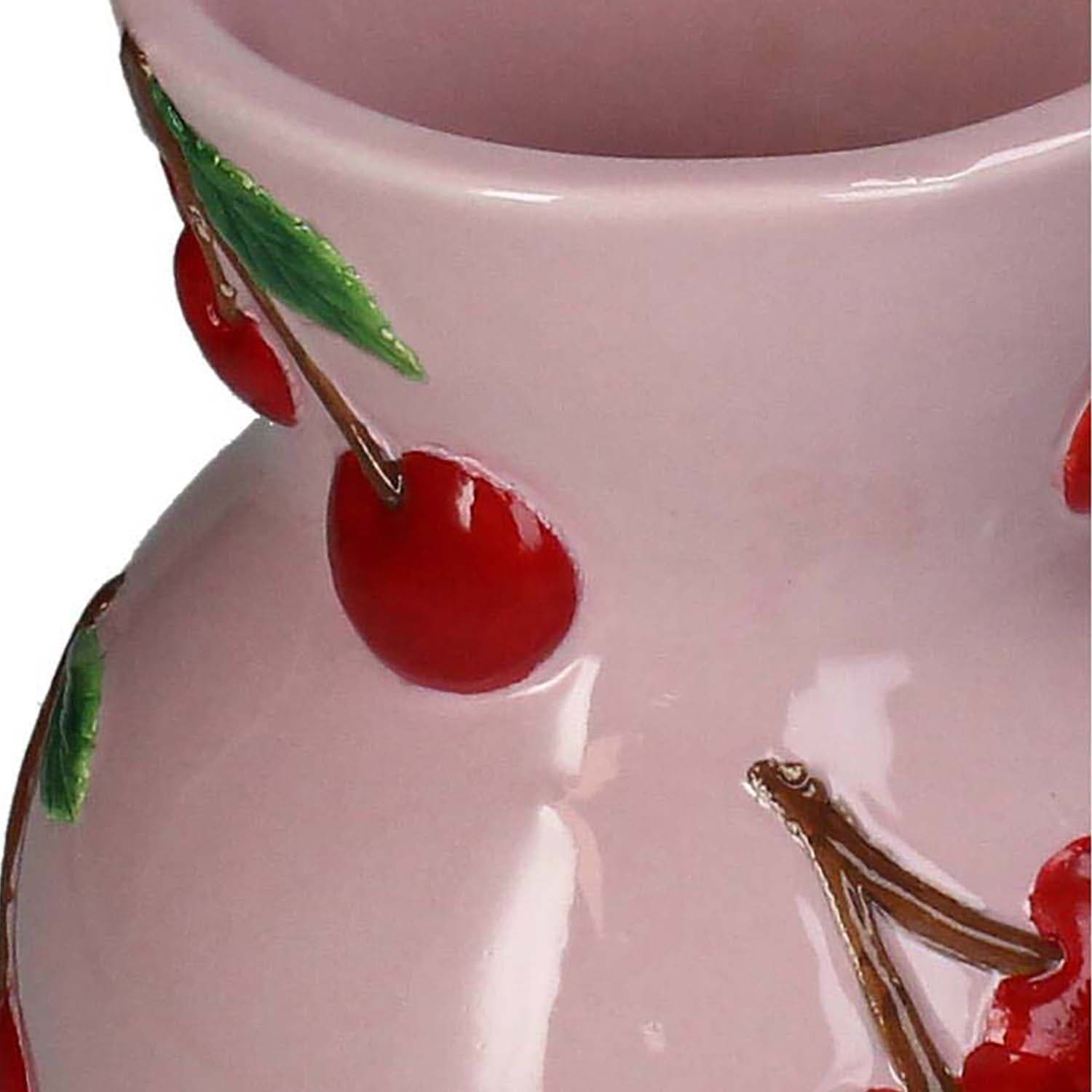Deze charmante vaas van Bomont met kersenmotief voegt een speelse en artistieke touch toe aan je interieur. Het glanzende roze keramiek is zorgvuldig versierd met levendige rode kersen, waardoor het een echte blikvanger is. Perfect voor een boeket bloemen of als een op zichzelf staand decoratief stuk. Het verfijnde ontwerp past moeiteloos in elke moderne of klassieke woonruimte. Maak van elke hoek een vrolijk en stijlvol plekje met deze unieke vaas. Een must-have voor liefhebbers van unieke en creatieve woonaccessoires.