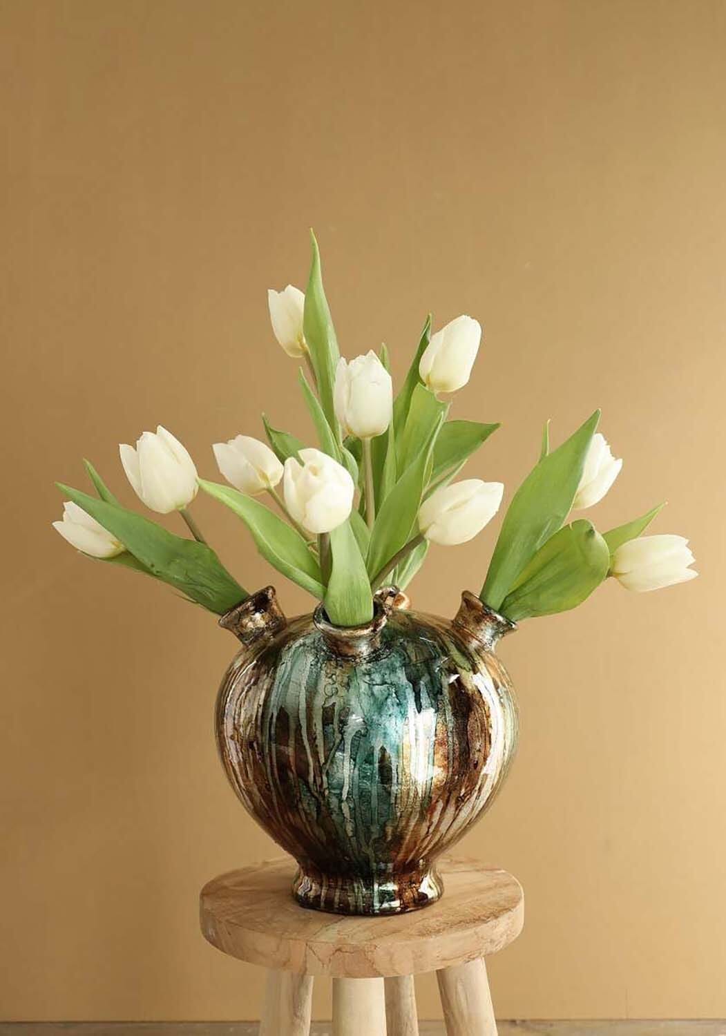 De Dazzle tulip vase Ø18 x h.18,5cm petrol gold van Bomont Collection, met een grafisch patroon, is een stijlvolle toevoeging aan elk interieur. Deze vaas combineert functionaliteit met een uniek design, ideaal voor het presenteren van bloemen op een artistieke manier.