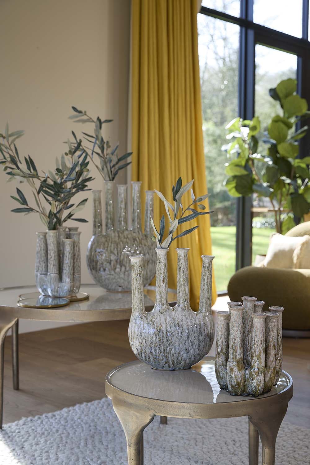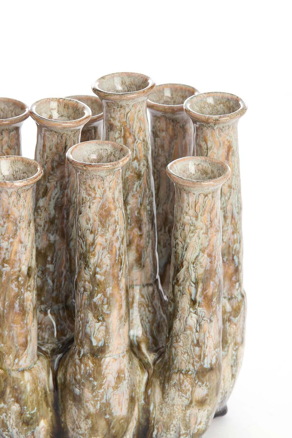 Deze sculpturale vaas combineert sophisticated minimalism met een organische, gemarmerde glasafwerking. De bundelvorm met meerdere smalle openingen houdt stelen elegant op hun plek en creëert direct een rustige, moderne compositie. Mooi met enkele takken, droogbloemen of als statement object op tafel of dressoir. De subtiele glans en natuurlijke kleurnuances geven je interieur een verfijnde, tijdloze uitstraling, zonder te overheersen.