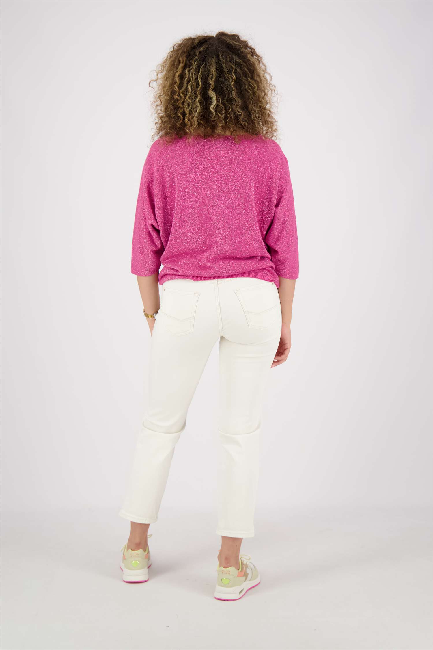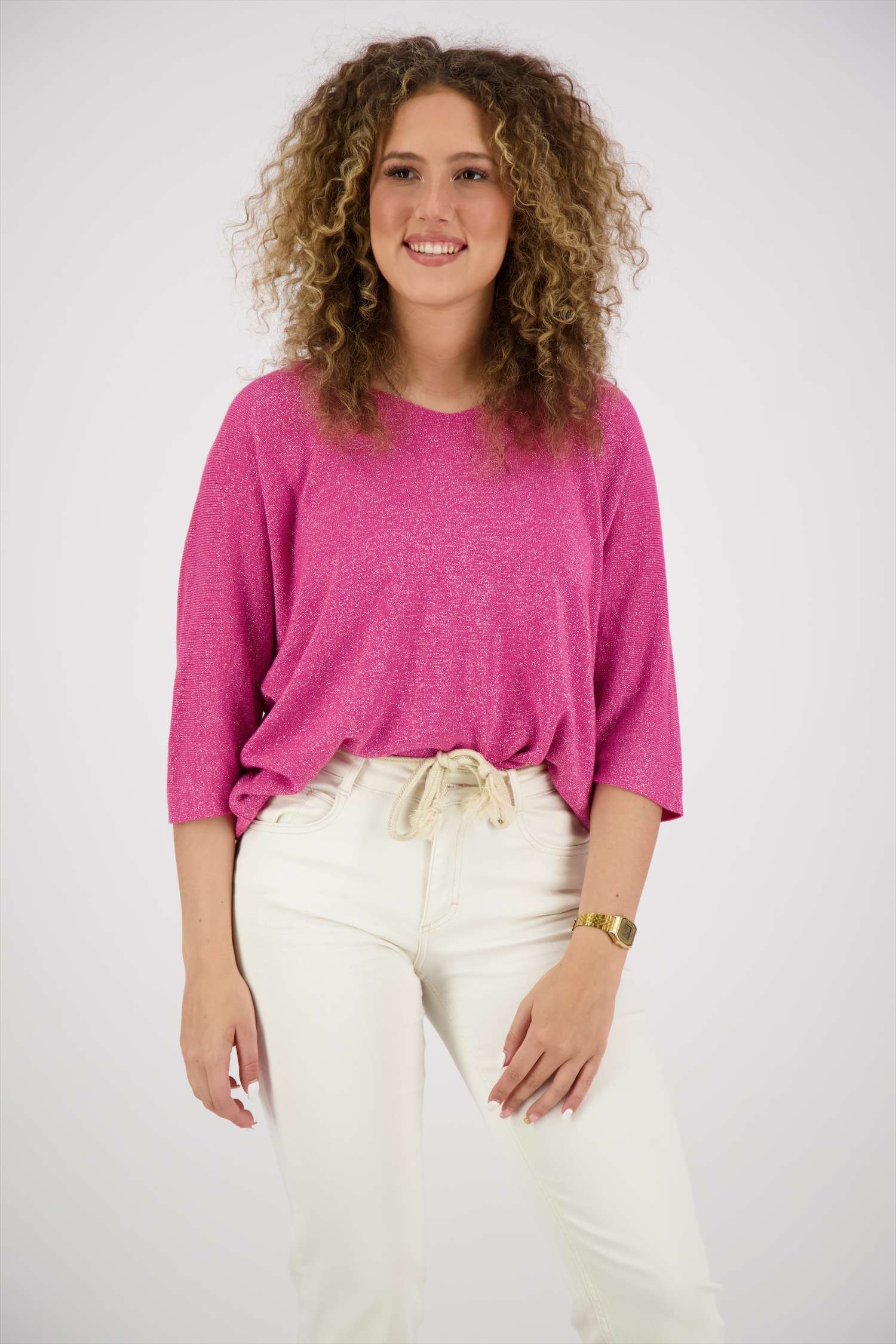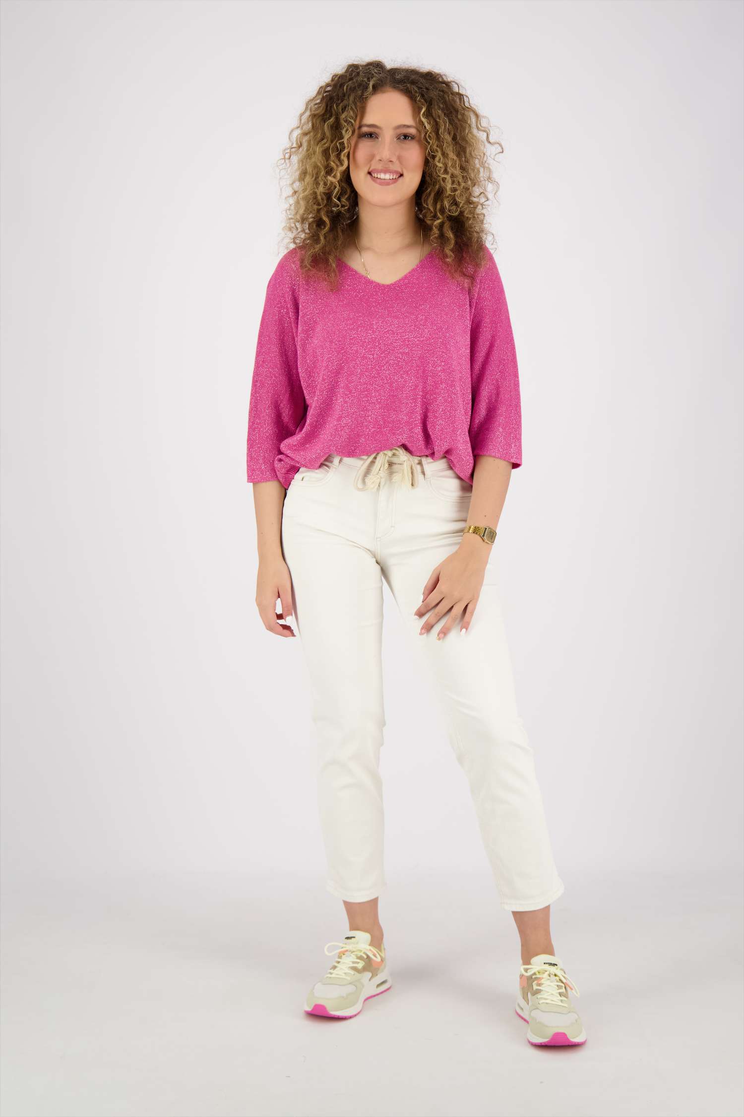 Wijdvallende top van Bomont met halve vlindermouwtjes. De top heeft een V-hals en een geribde zoom. Het metallic glitterdraadje geeft een leuk detail aan de top.
