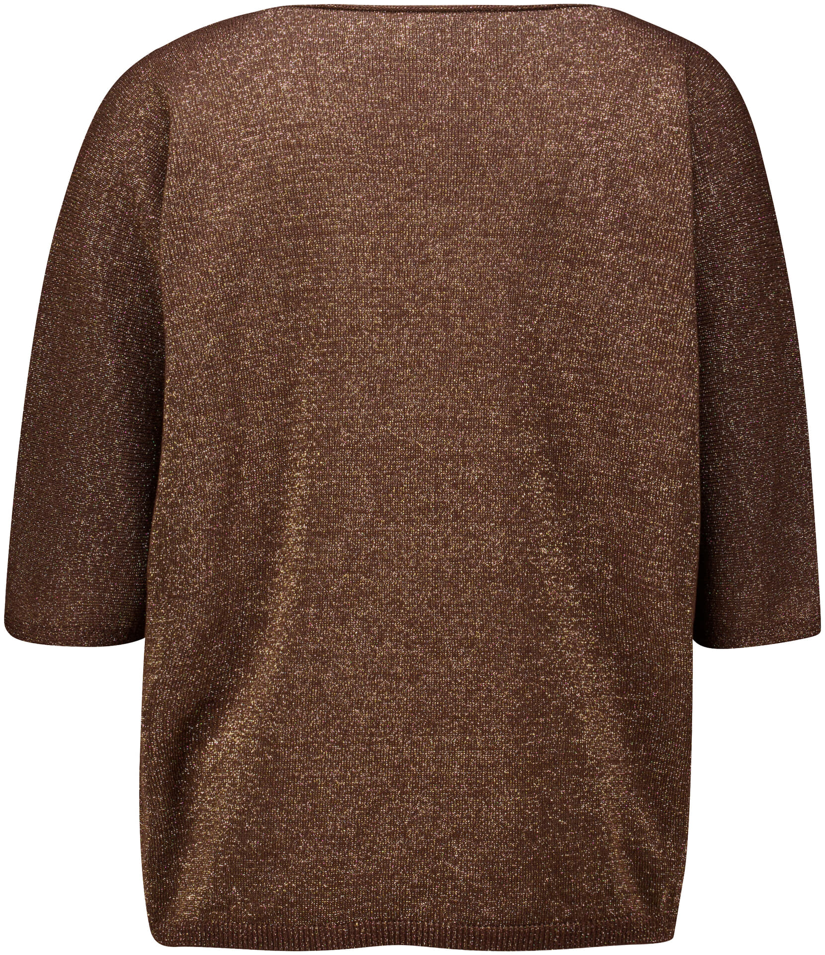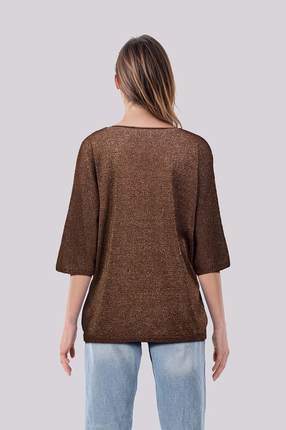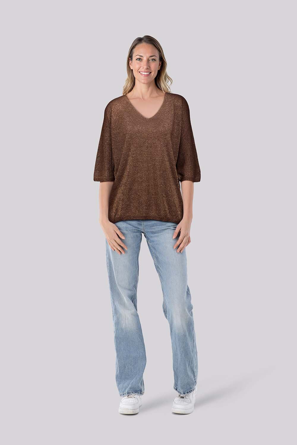 Wijdvallende top van Bomont met halve vlindermouwtjes. De top heeft een V-hals en een geribde zoom. Het metallic glitterdraadje geeft een leuk detail aan de top.